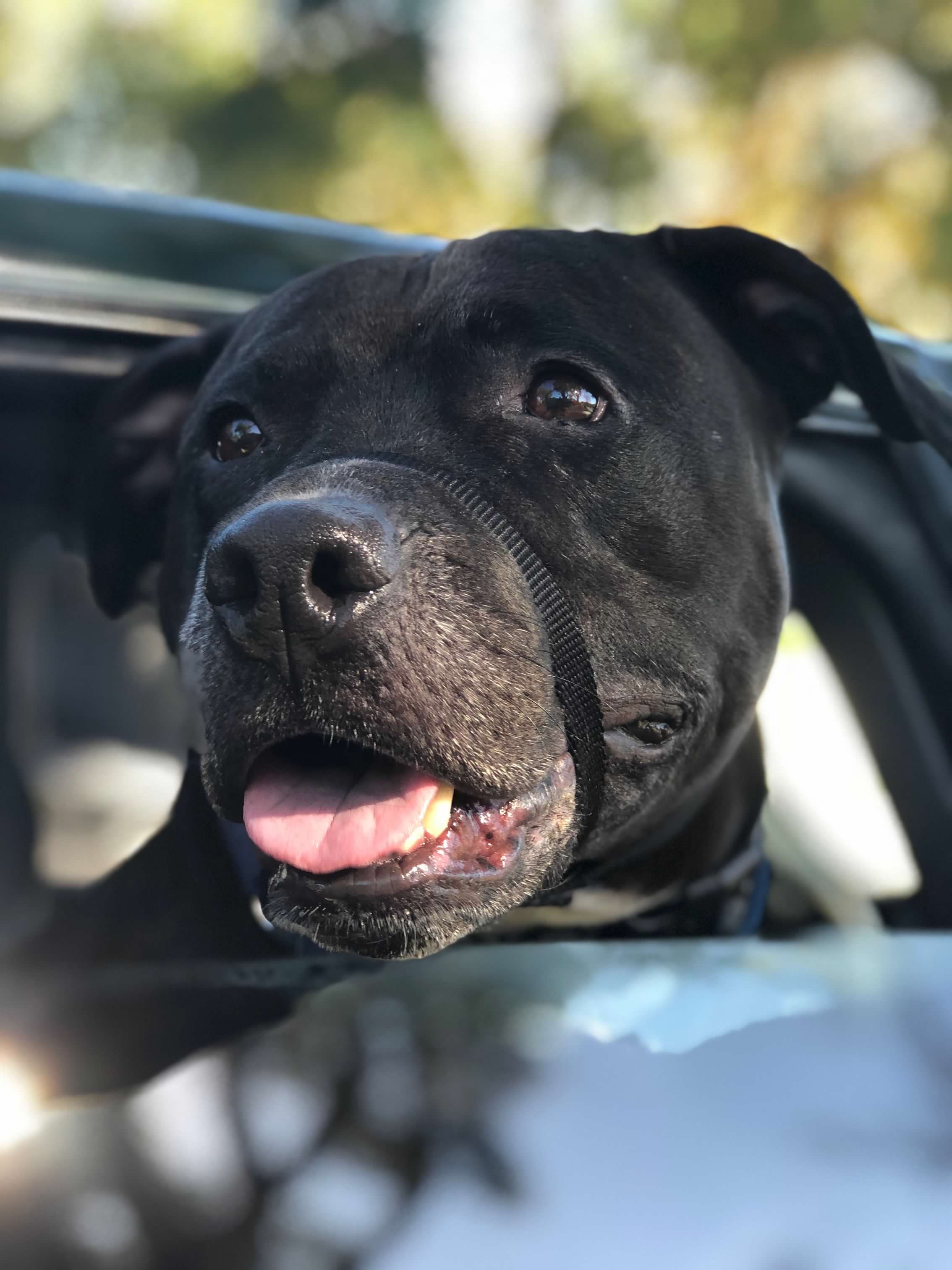 Painting of a black dog`s head and shoulders looking out a car window.
