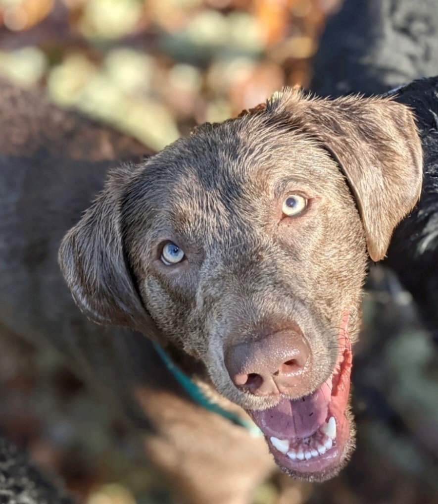 Painting of a dog with blue eyes and an open mouth, wearing a blue collar.