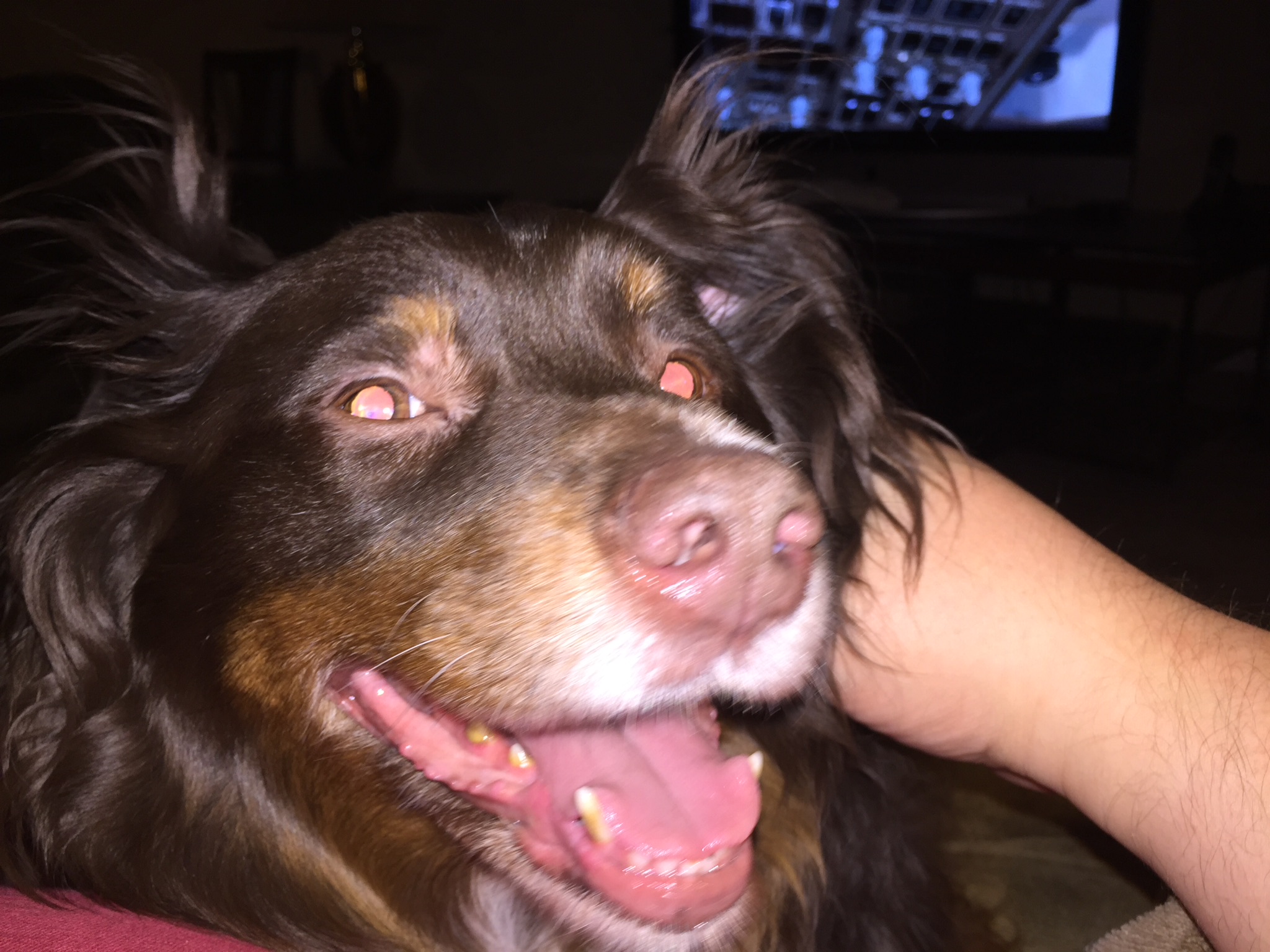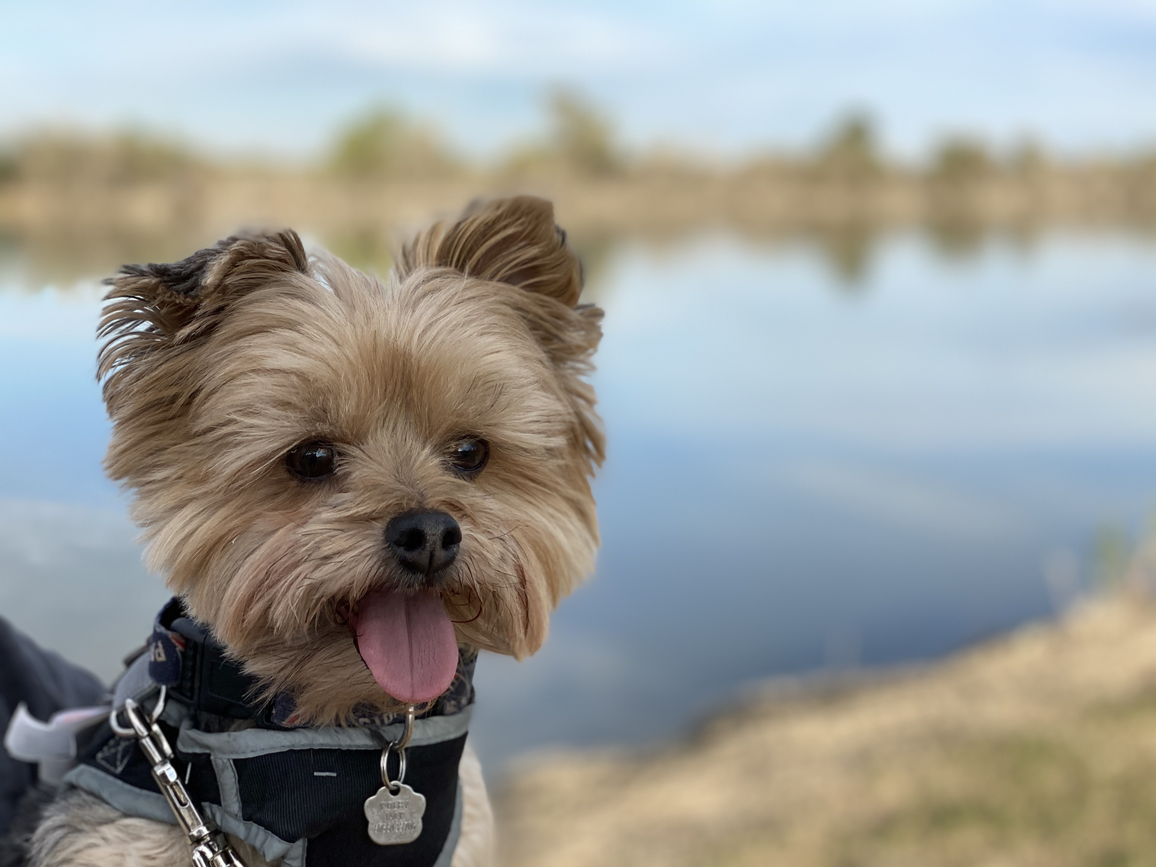 Painting of a Yorkshire Terrier wearing a harness and tongue out.