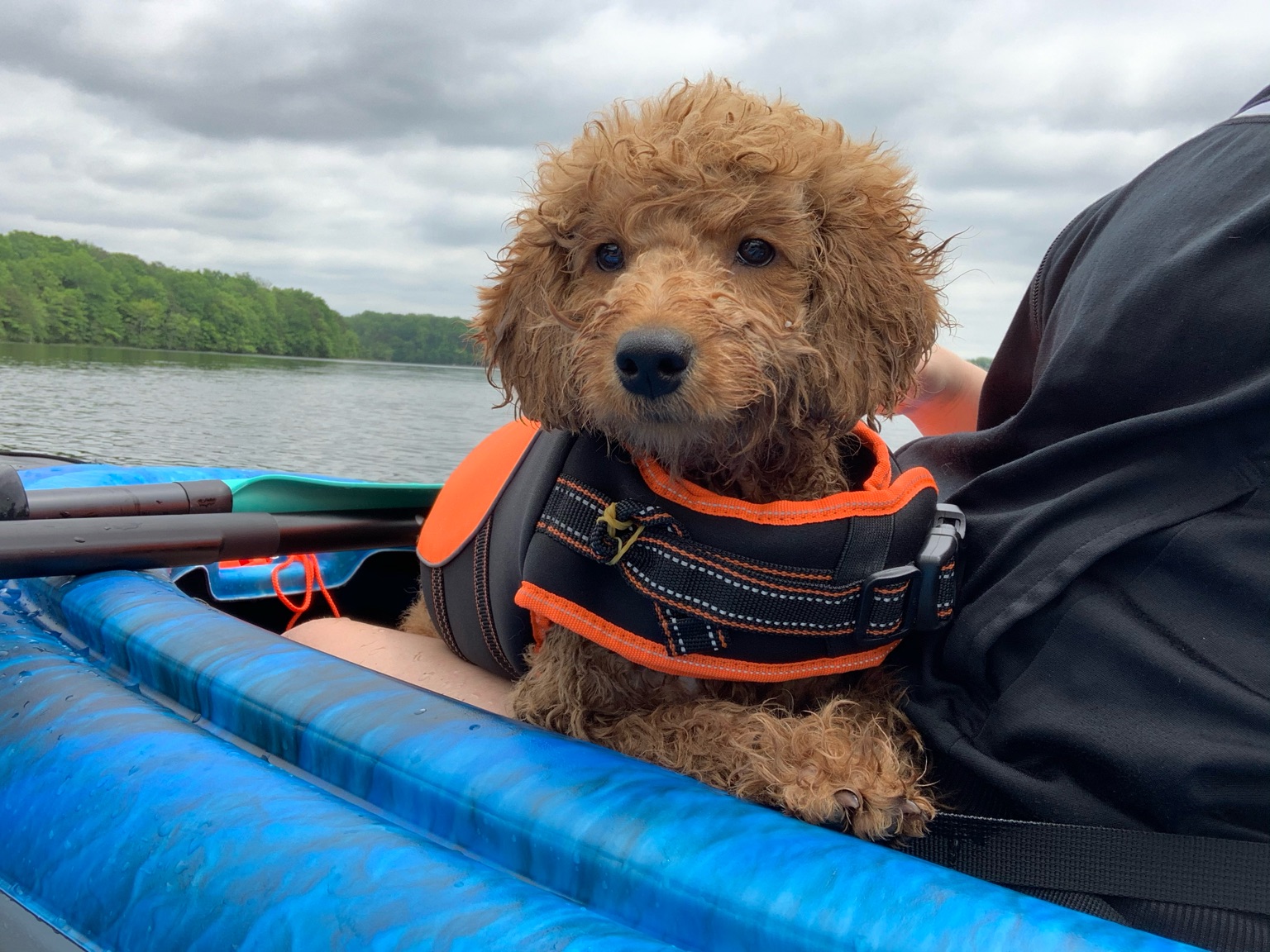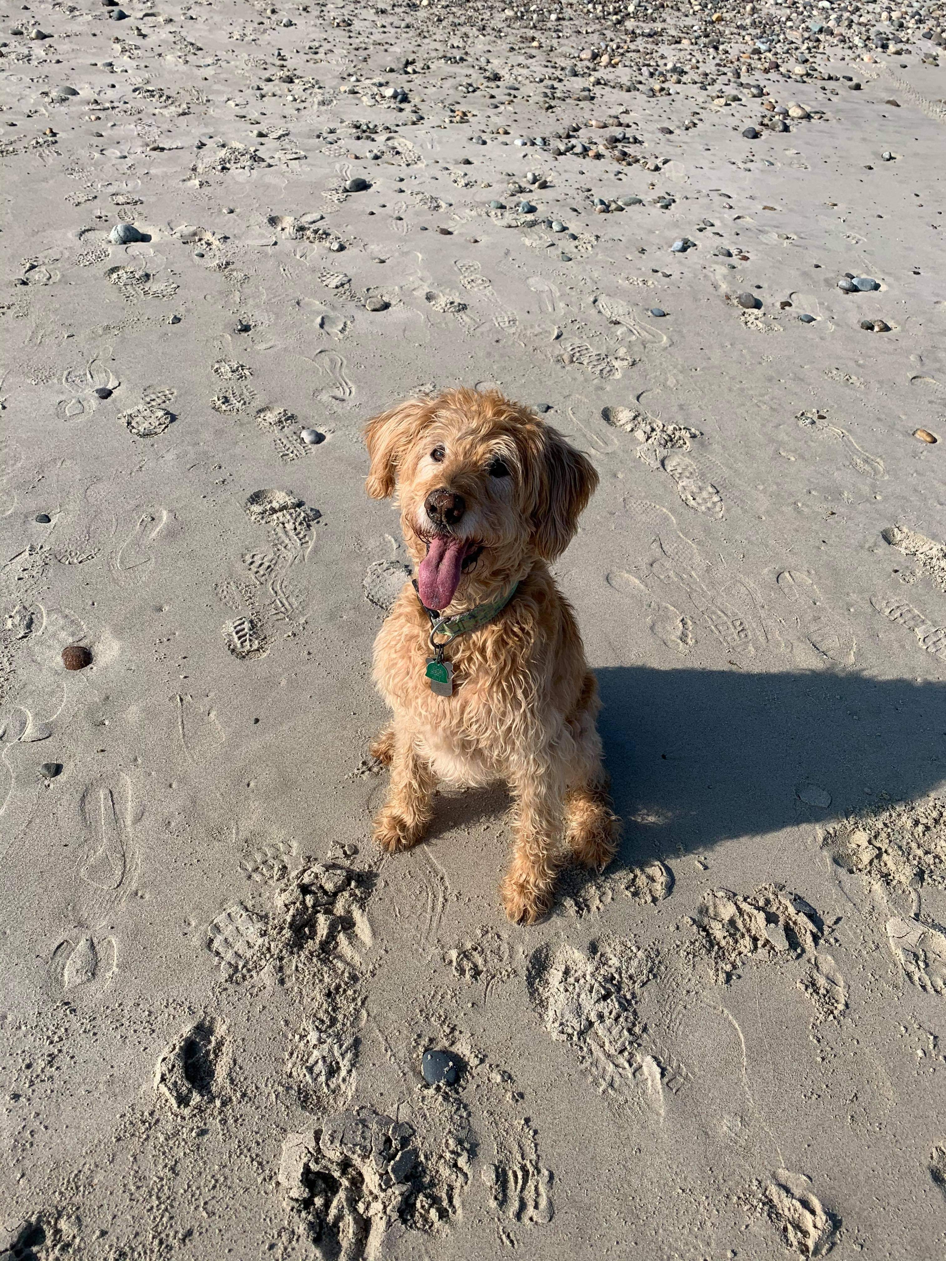 Painting of a golden doodle dog sitting on a beach, looking at the viewer.
