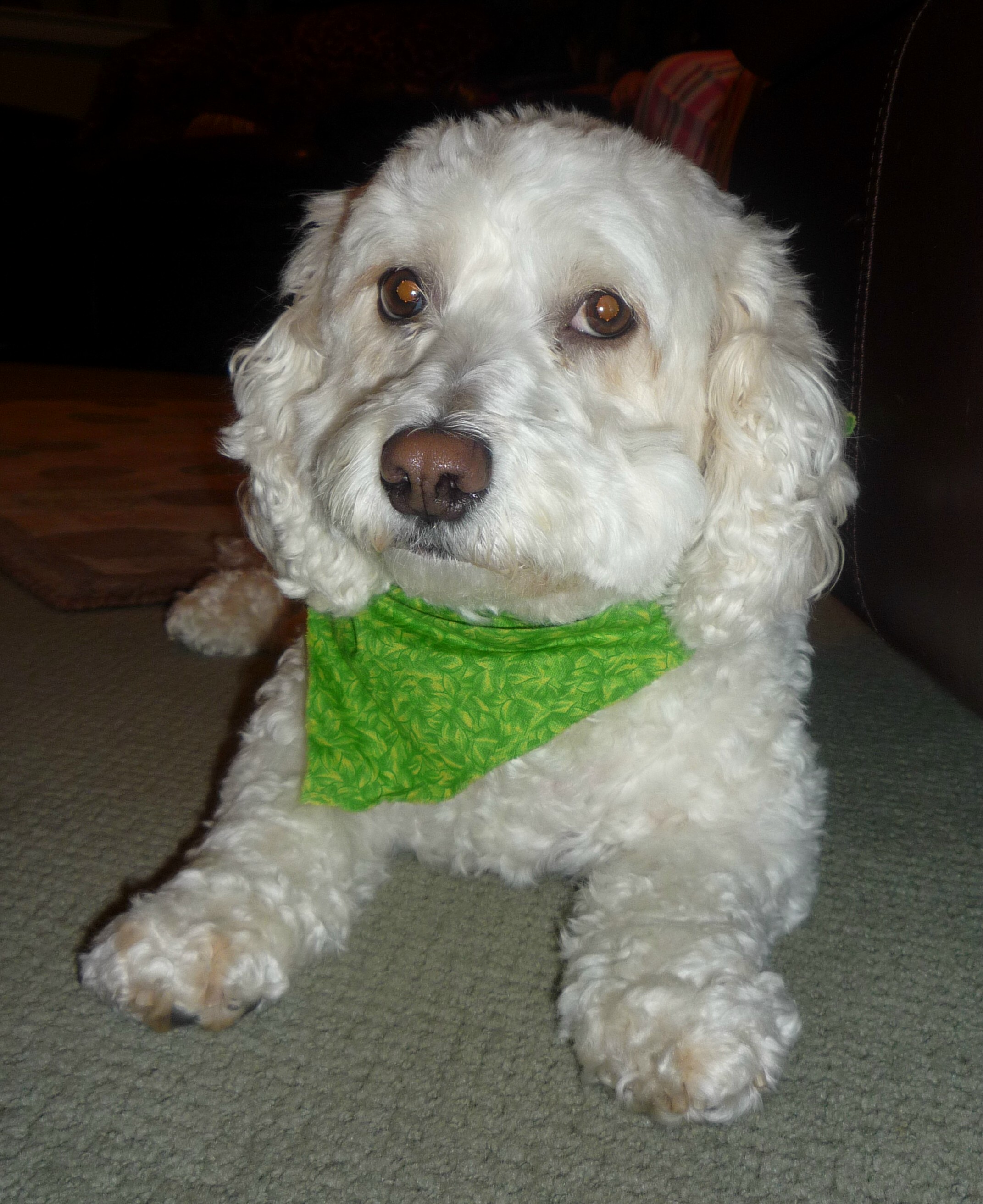 Framed painting of a white dog wearing a green bandana