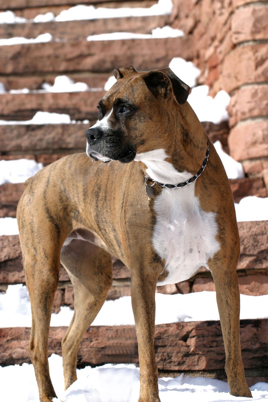 Framed portrait of Roxy, a brindle Boxer dog, with a woman.
