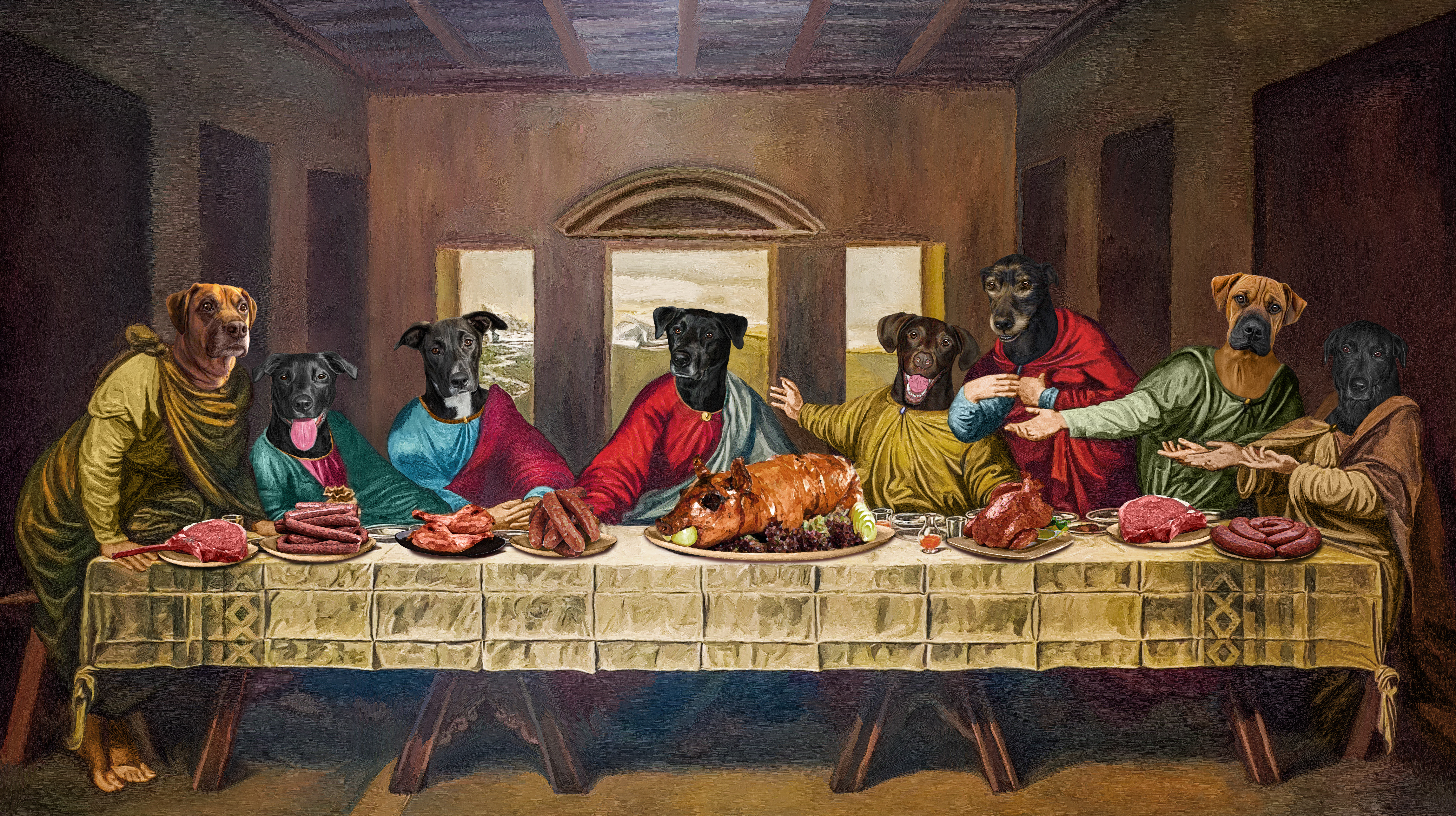 Dogs depicted in a Last Supper parody painting.
