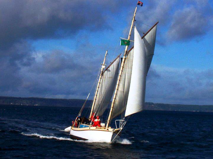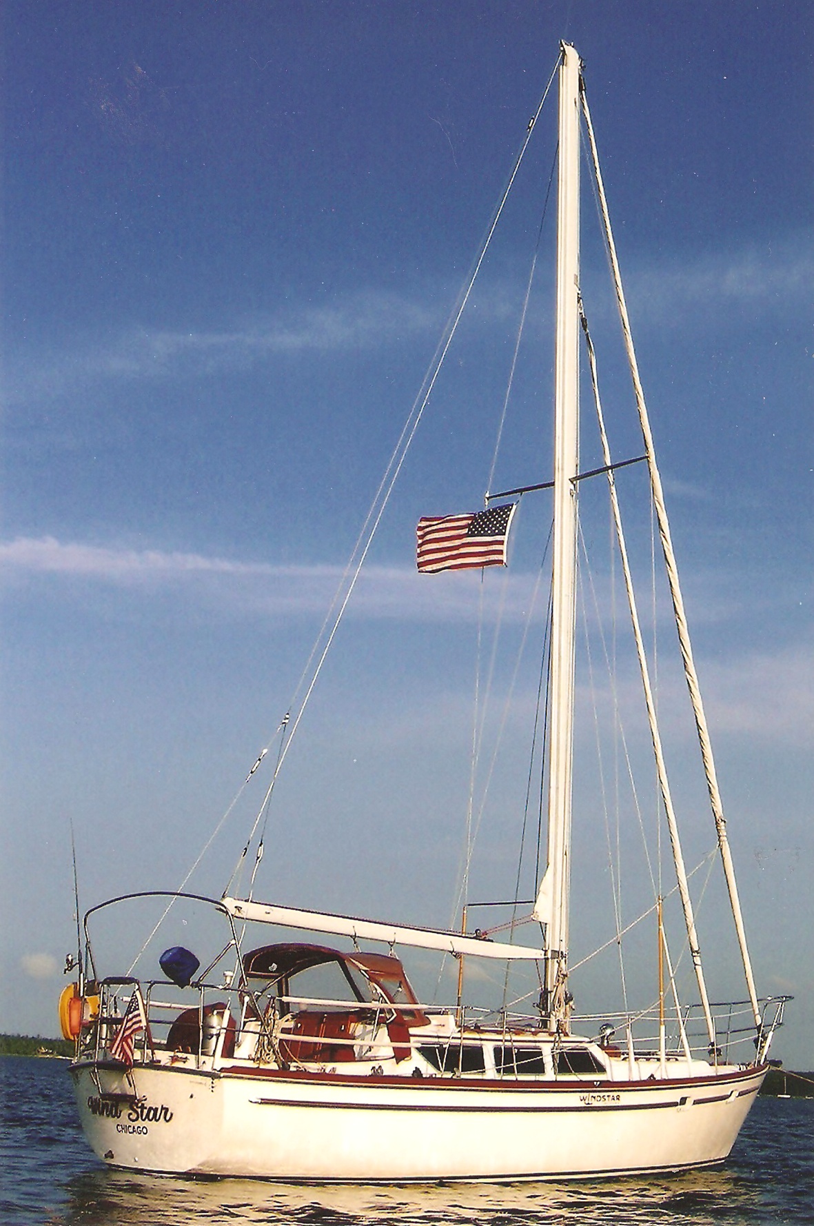 Painting of a sailboat named Wind Star, Chicago, with an American flag.
