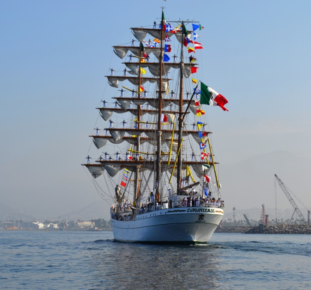 Painting of a large sailing ship with numerous flags and crew members on deck.