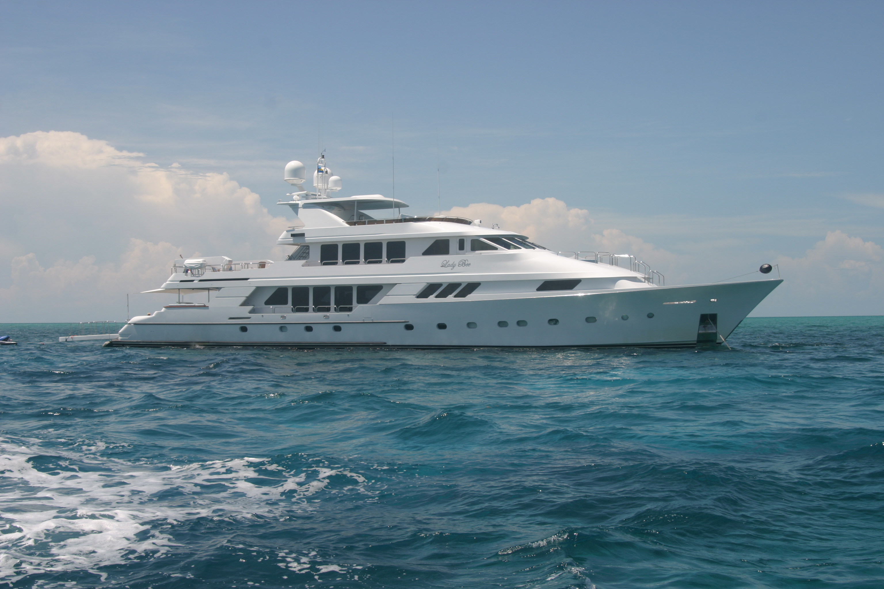 Painting of a large white yacht on the ocean under a partly cloudy sky.