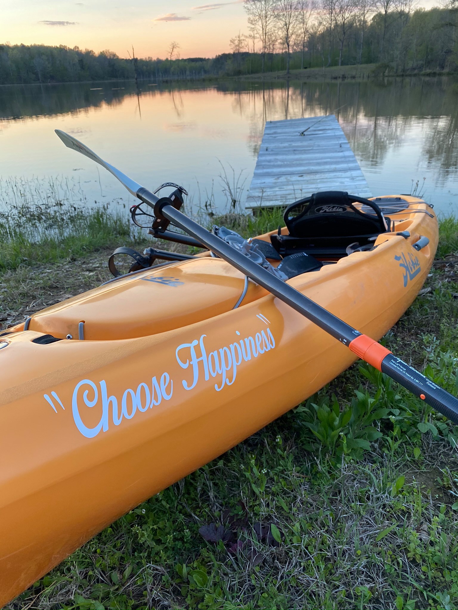 Orange kayak with Choose Happiness painted on the side, resting on the grassy bank of a calm lake at sunset.