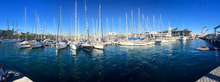Painting of sailboats docked at a marina reflecting in calm water under a blue sky.
