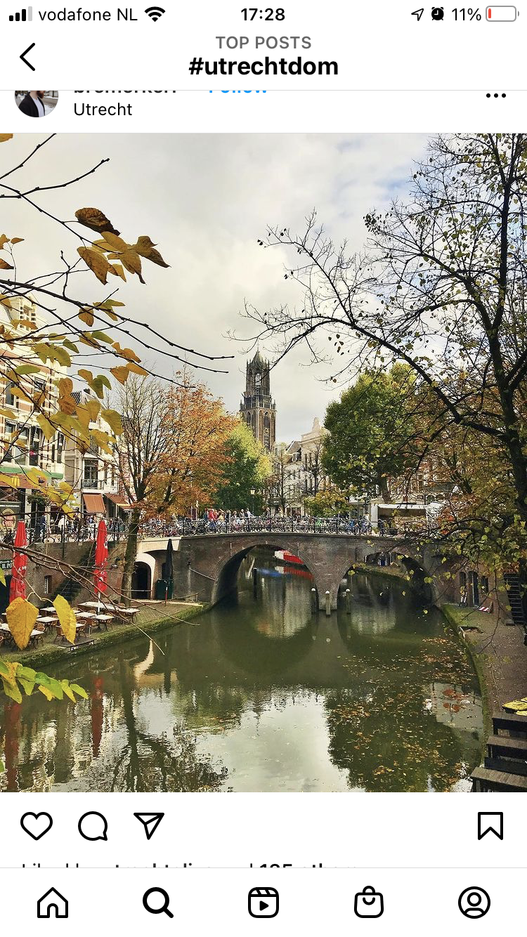 Painting of a rowing team on a canal under a bridge, autumnal trees and buildings in the background.