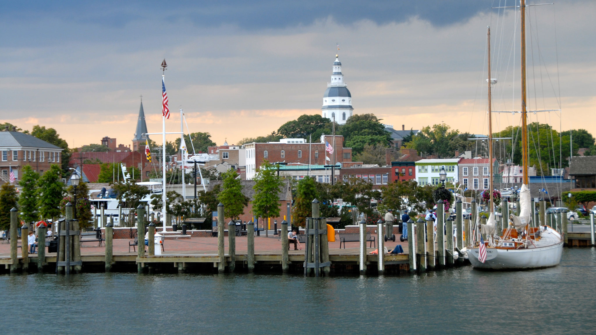 Boat on water near Annapolis, Maryland state house visible in background.