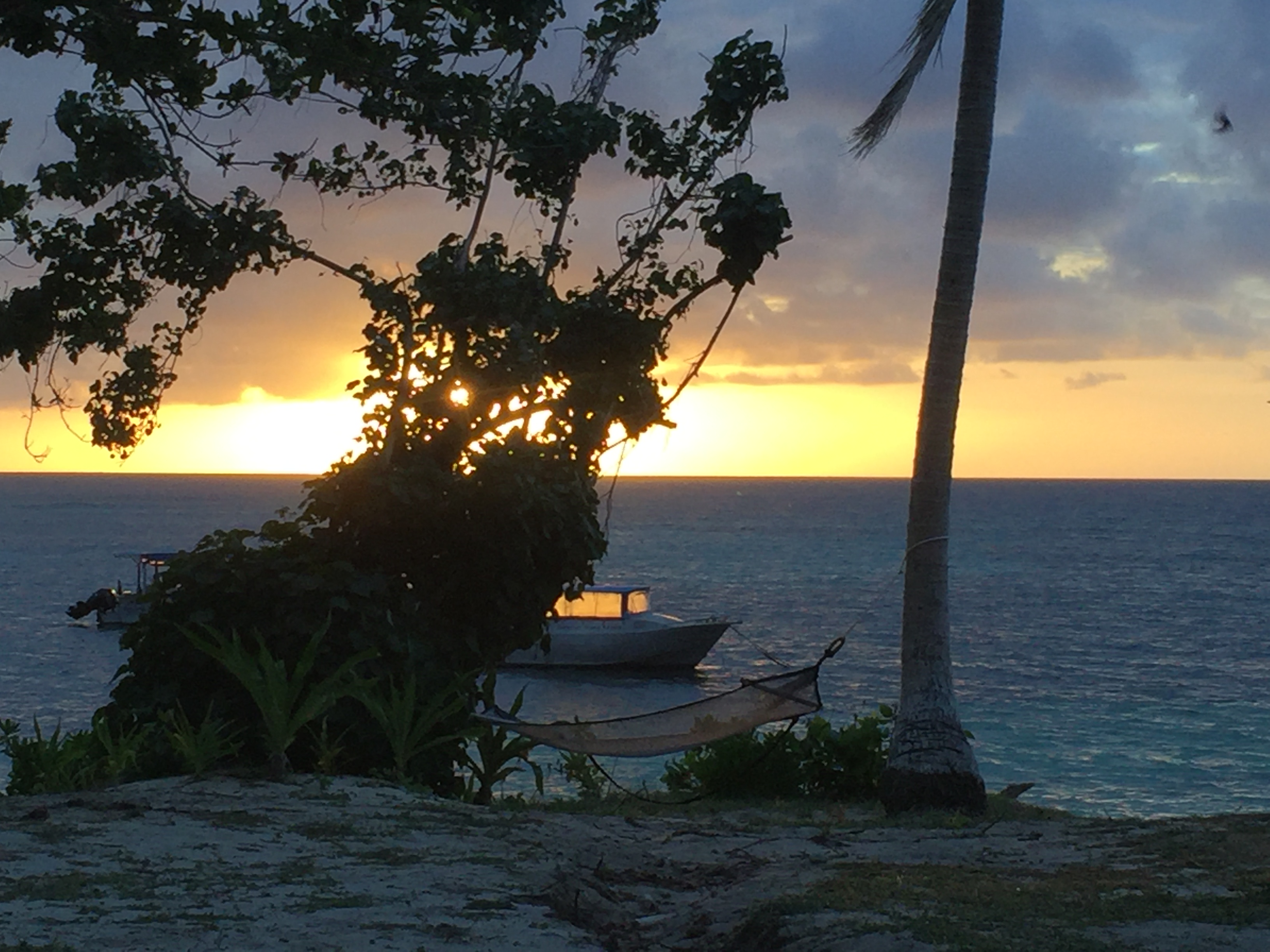 Sunset over calm ocean, hammock between trees, small boat moored nearby.
