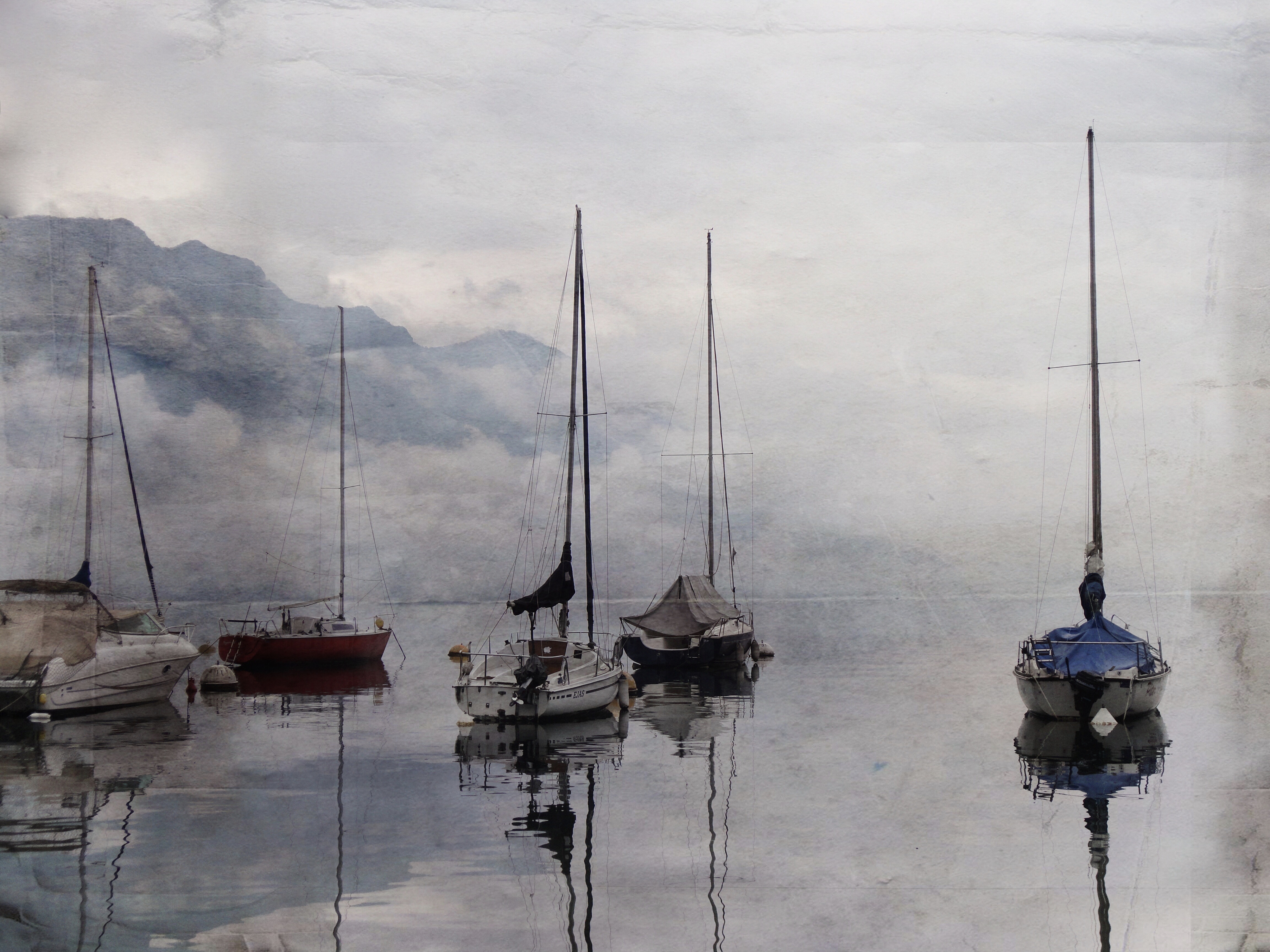 Sailboats moored in foggy harbor, mountains in background.