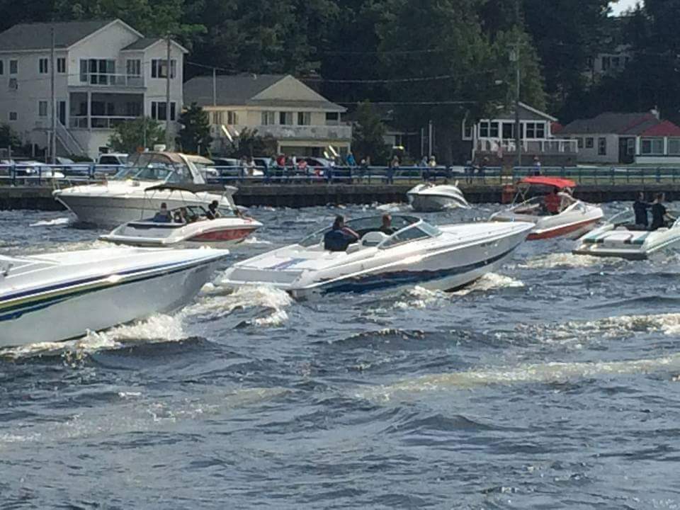 Painting of motorboats on water near houses.