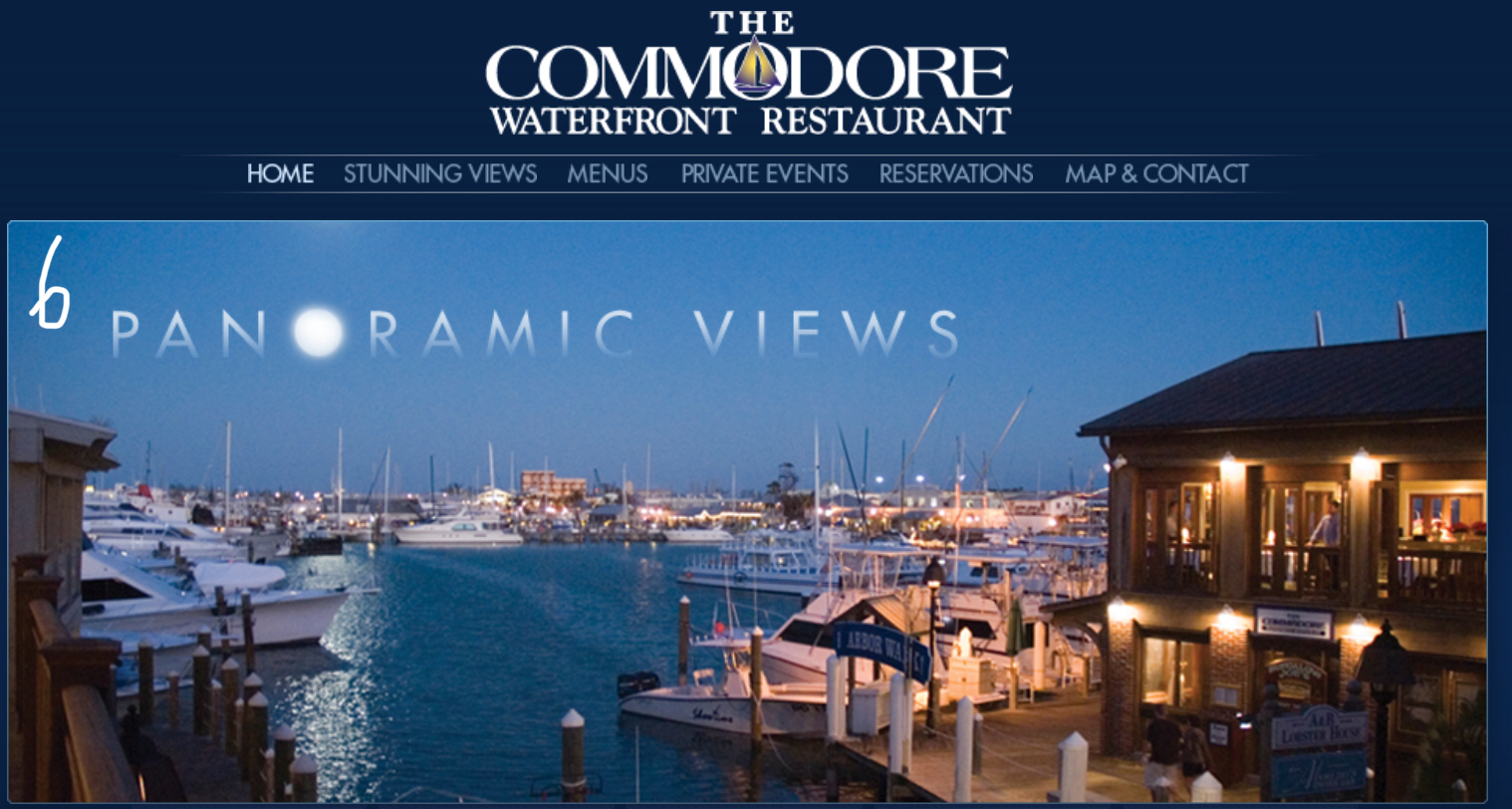 Night scene of The Commodore restaurant at Harbor Walk with a yacht docked.