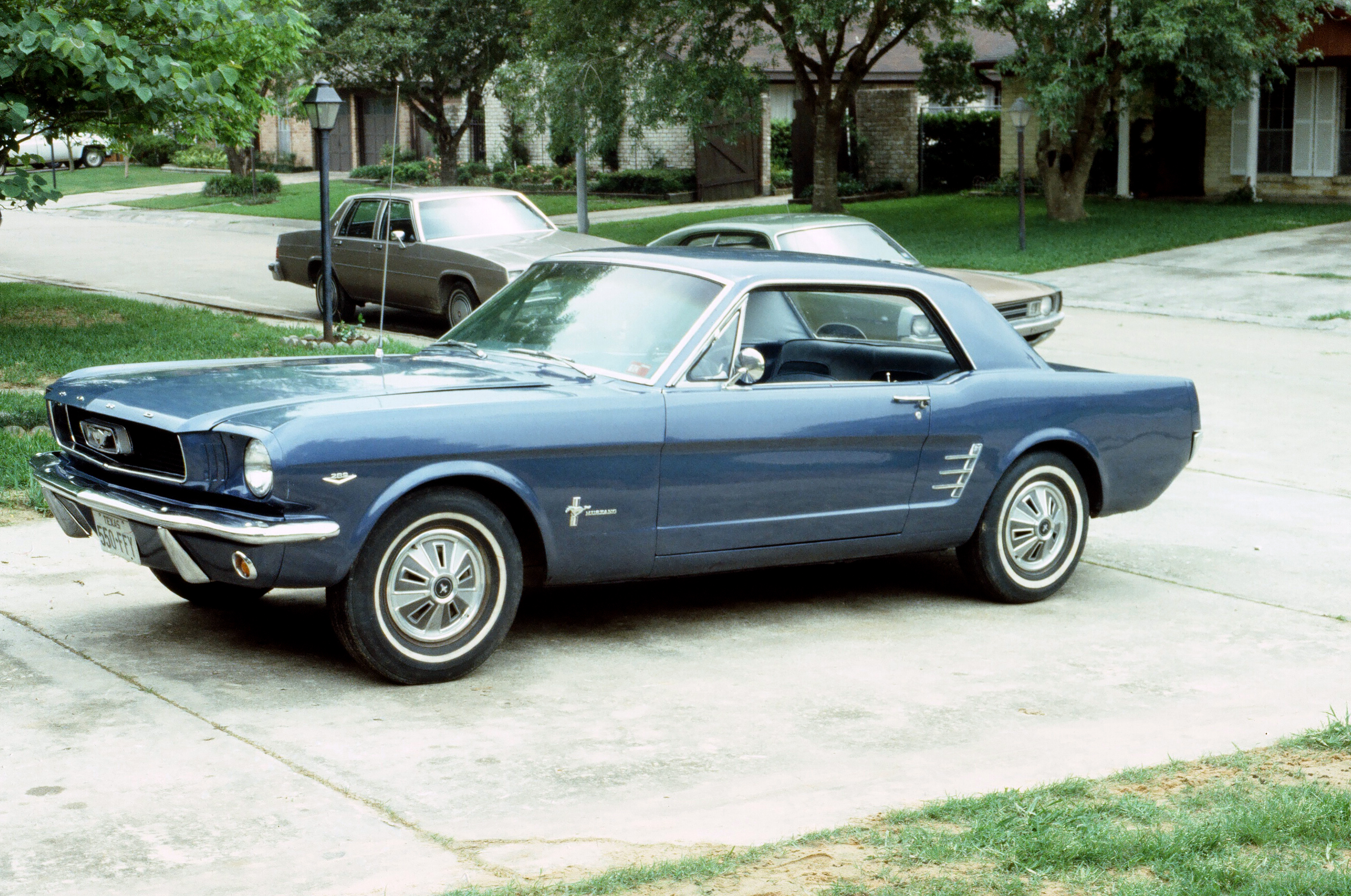 Painting of a blue Ford Mustang coupe