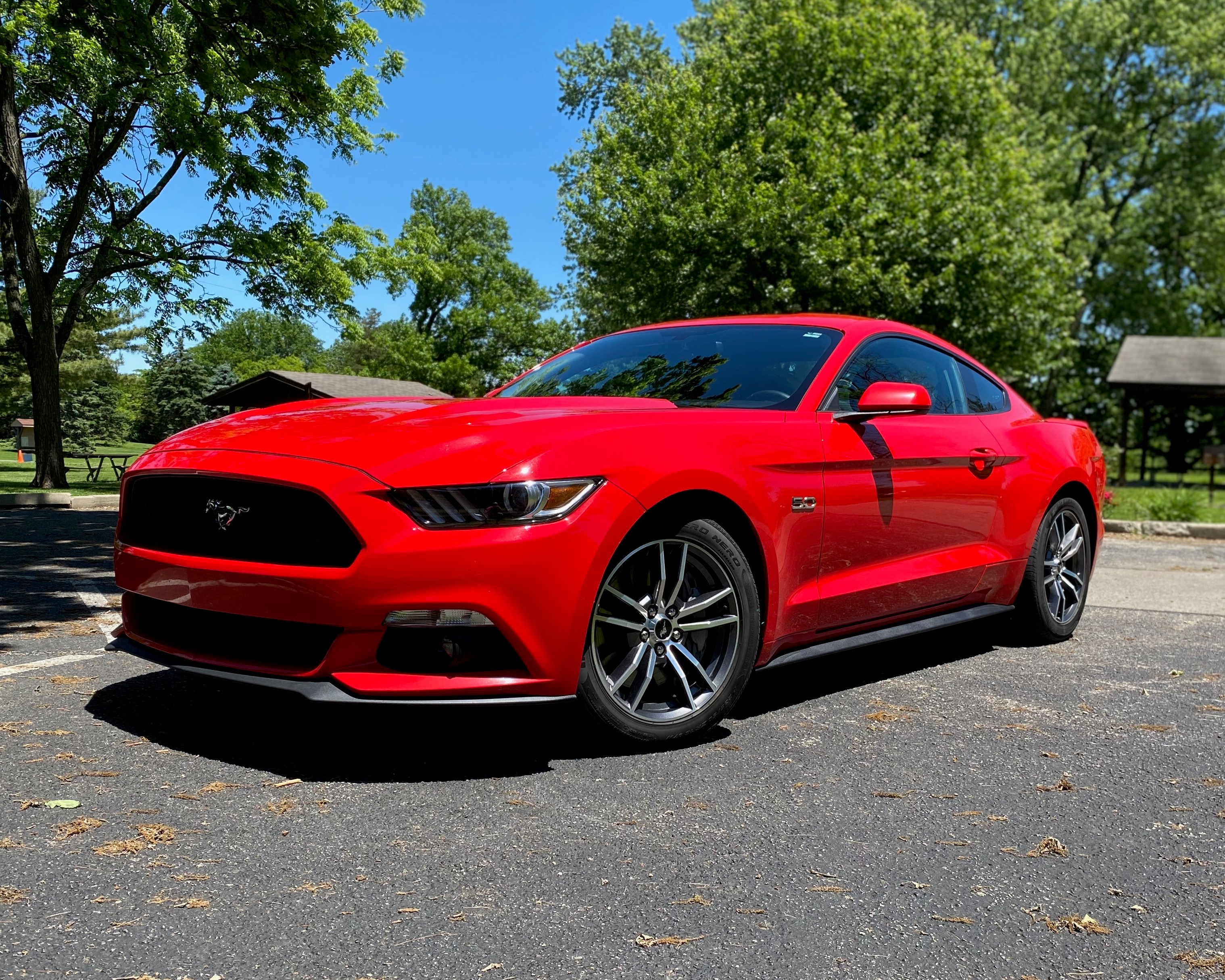 Painting of a red Ford Mustang parked under trees.