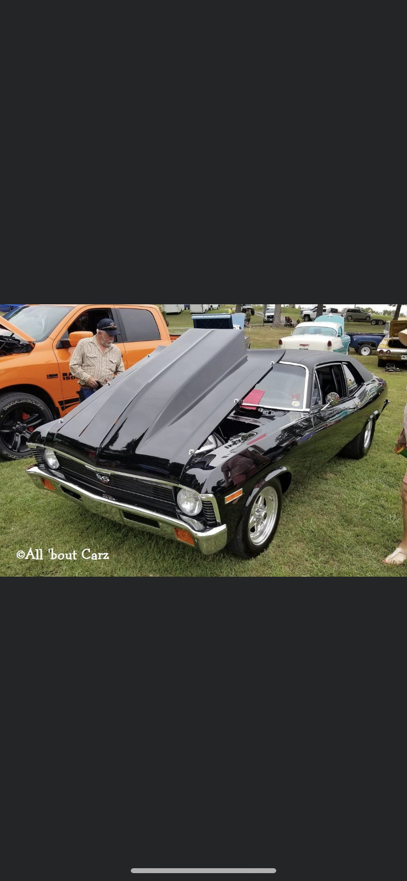 Painting of a black Chevrolet Nova with its hood raised.