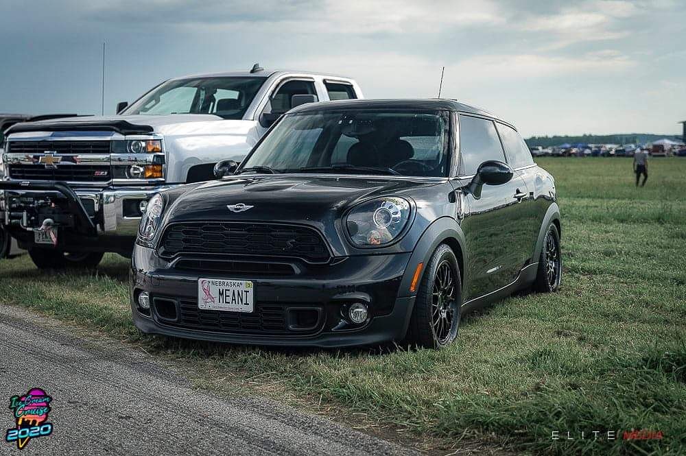 Painting of a black Mini Cooper parked in a grassy field.