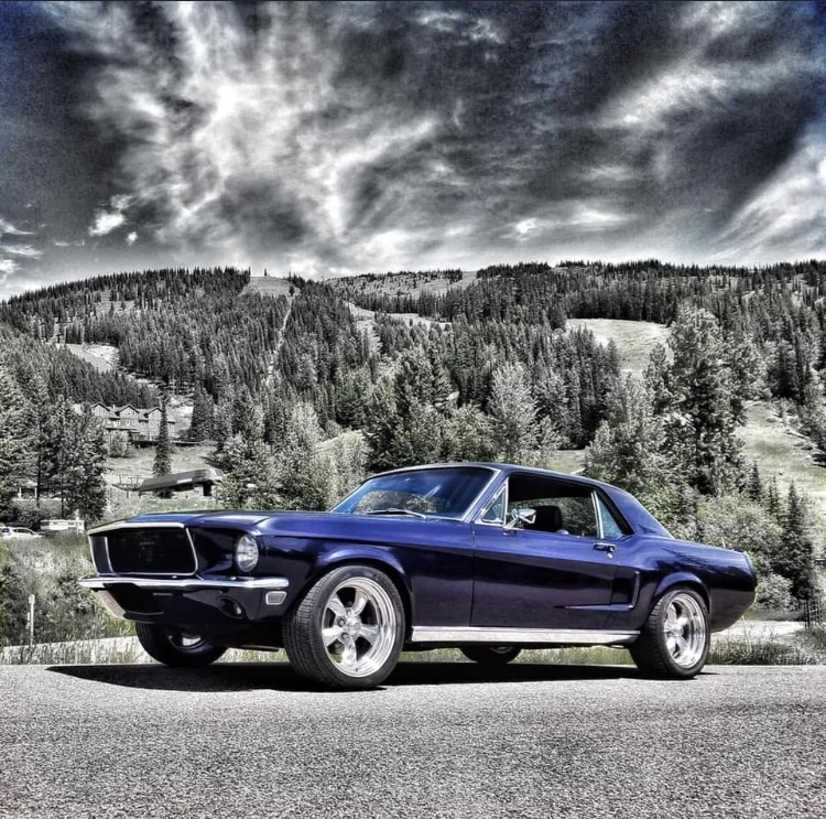 Painting of a black Ford Mustang parked in front of a forested hillside.