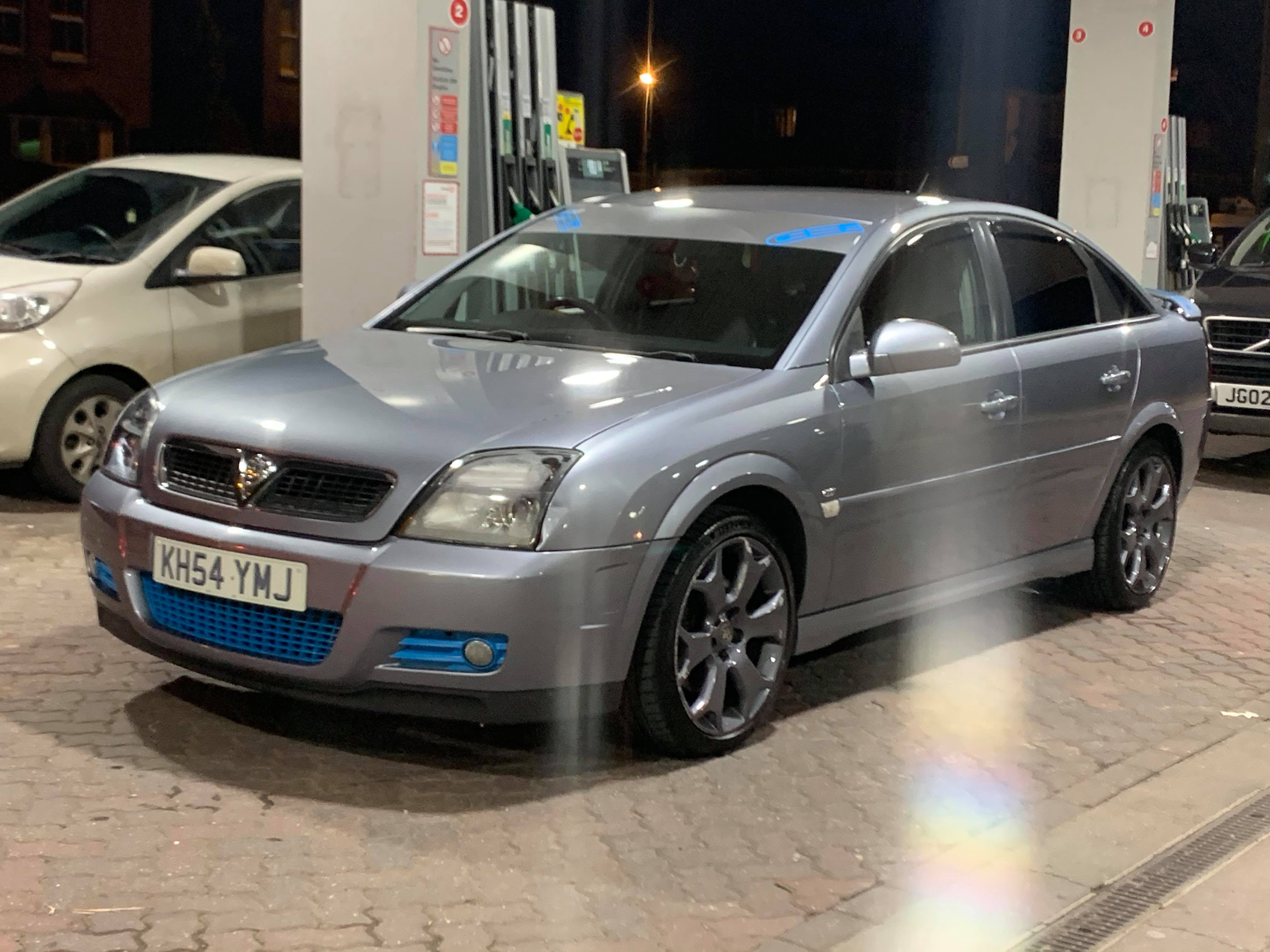 Silver Vauxhall Vectra parked outside a vintage garage.