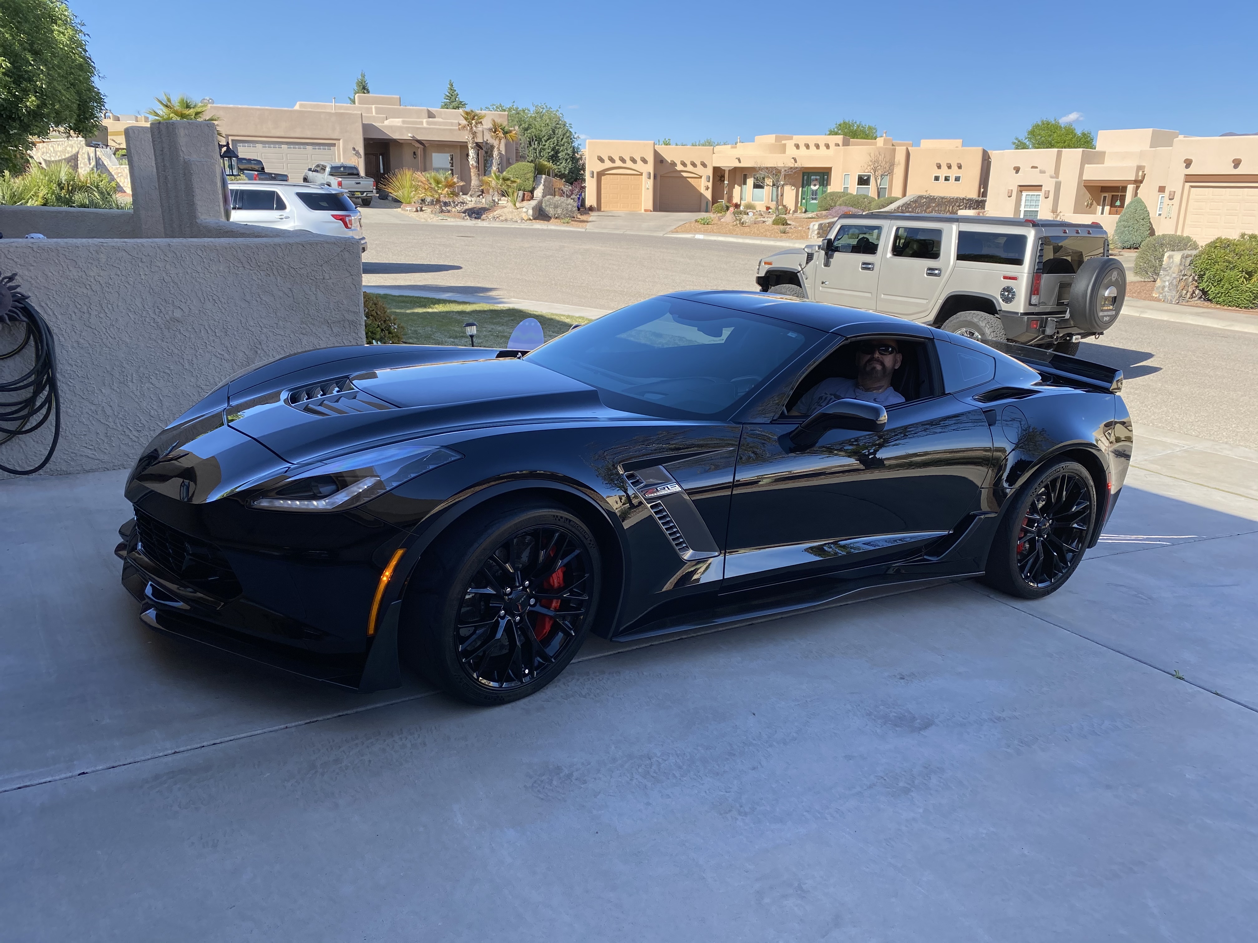 Painting of a man in a black Corvette in a driveway