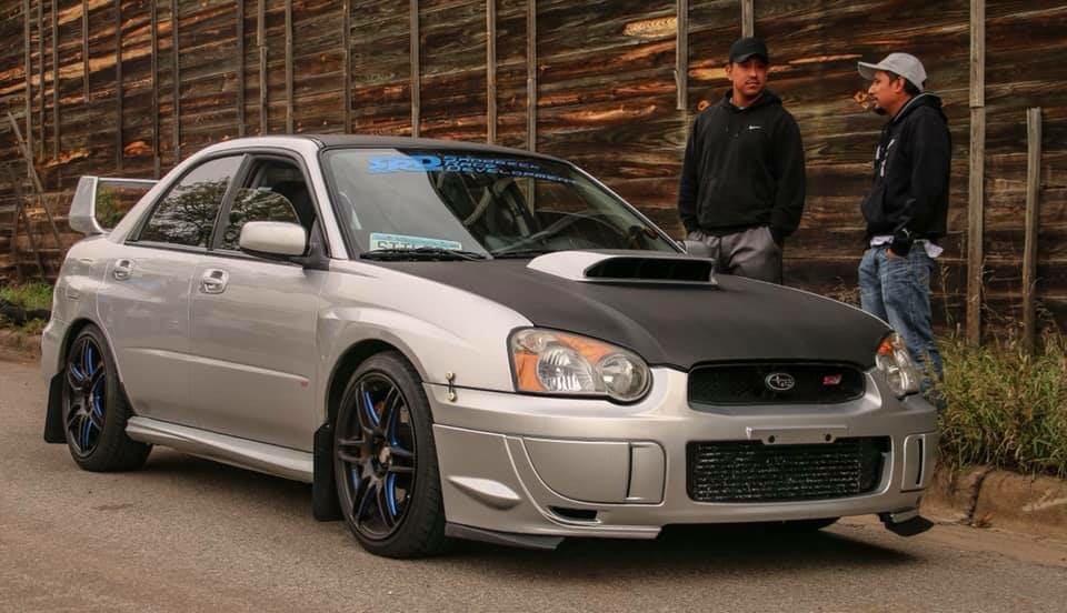 Painting of a silver Subaru WRX STI on a dirt road