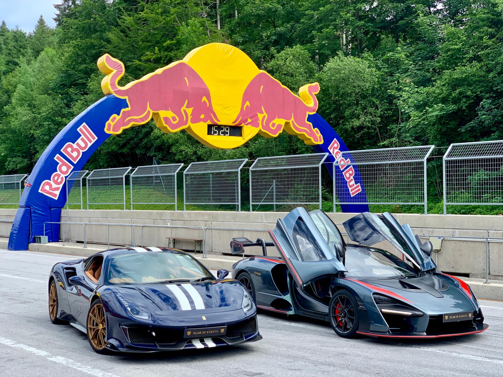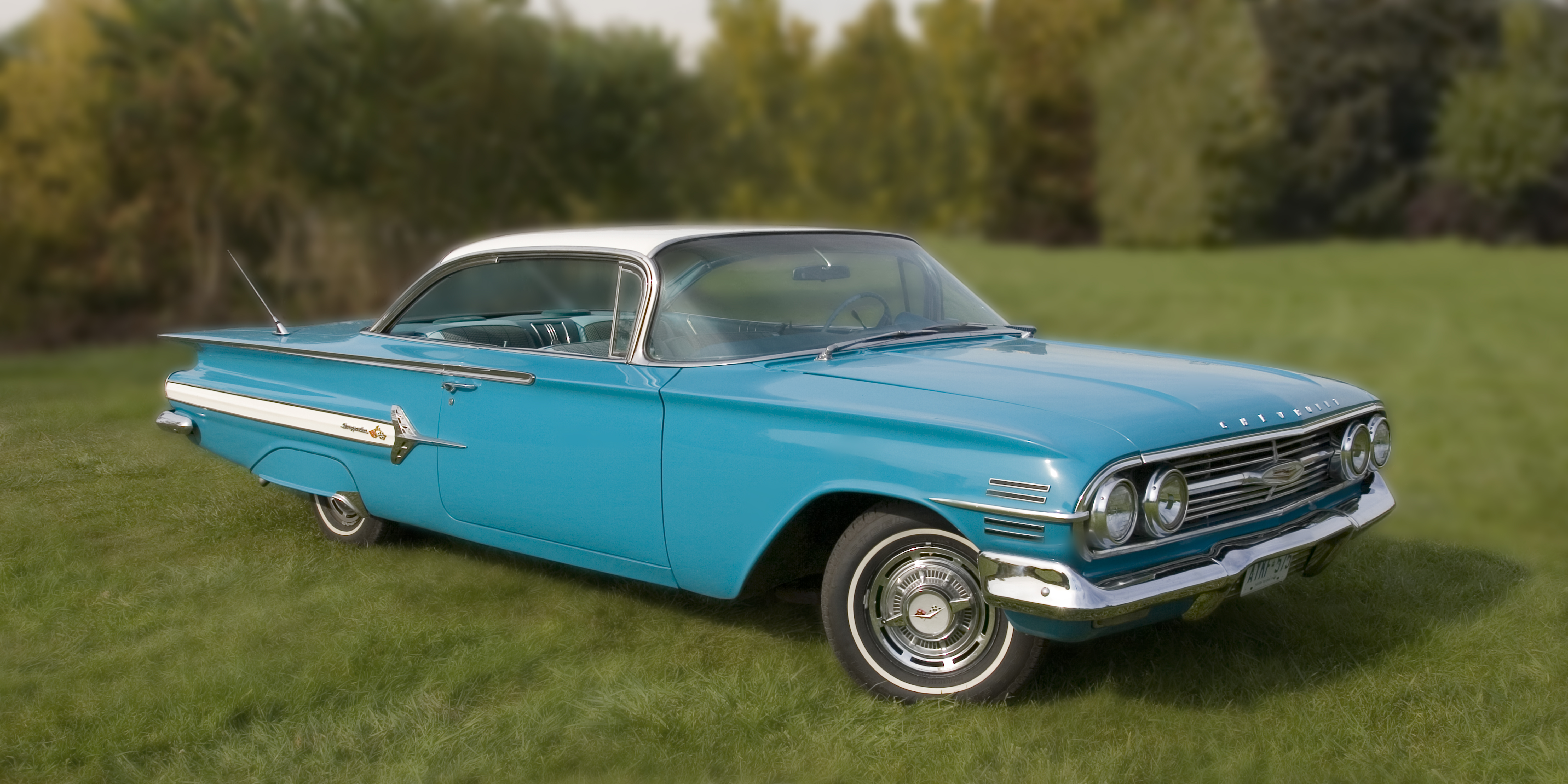 Painting of a 1950s diner with a blue and red classic car parked in front.