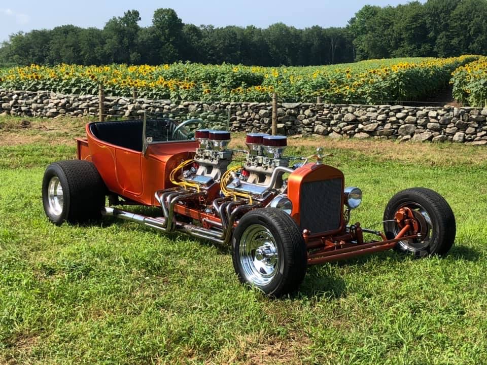 Painting of a lavender 1952 Chevrolet pickup truck with Texas license plate PAPS52 parked on grass near a wooden building.