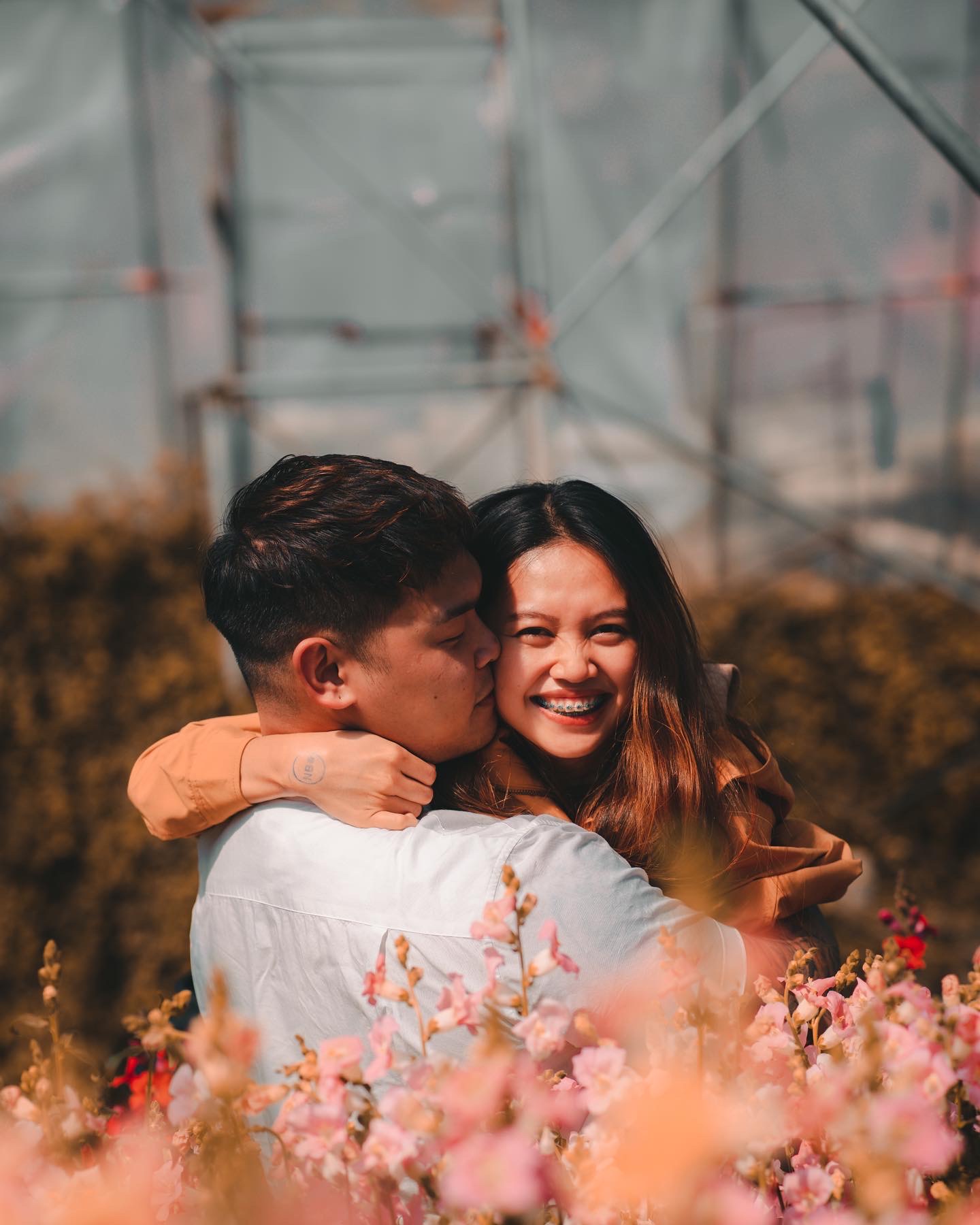 Painting of a couple embracing, surrounded by flowers, with a metal structure in the background.