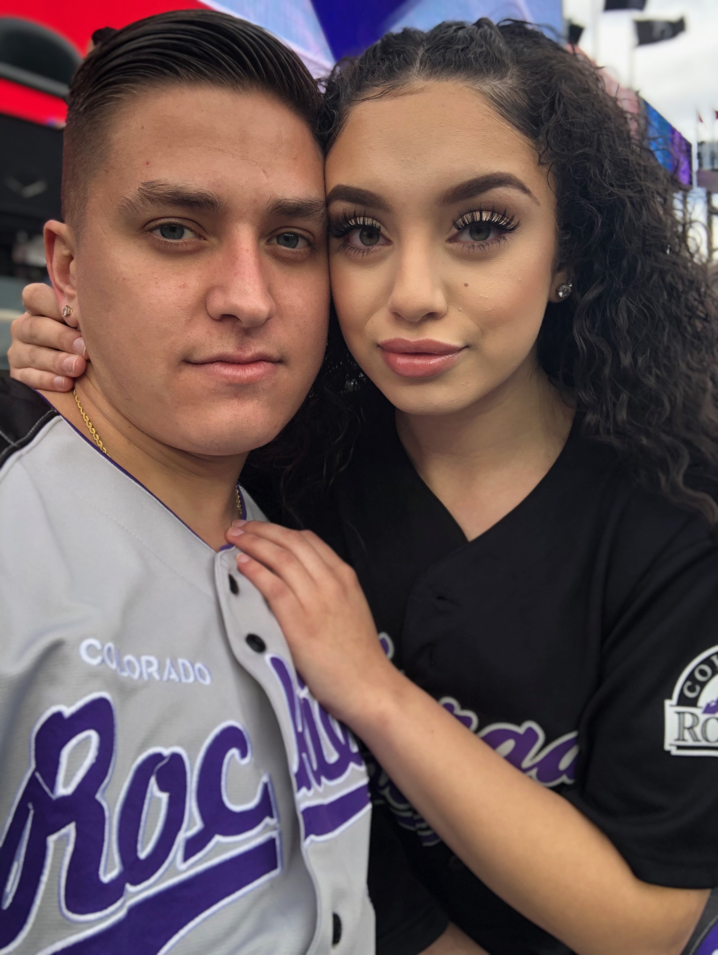 Painting of a young couple embracing, the man wears a Colorado Rockies baseball jersey.