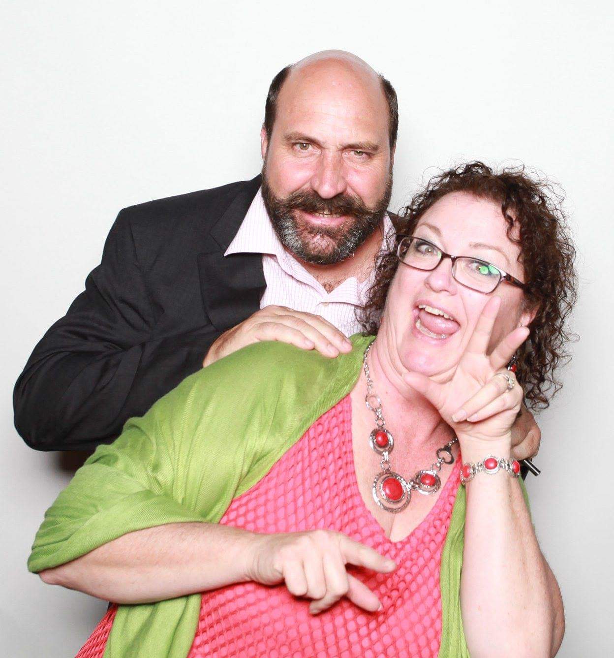 Painting of a couple, the man is bald with a beard and wearing a suit, the woman has dark curly hair, glasses, and is wearing a red dress and green shawl.