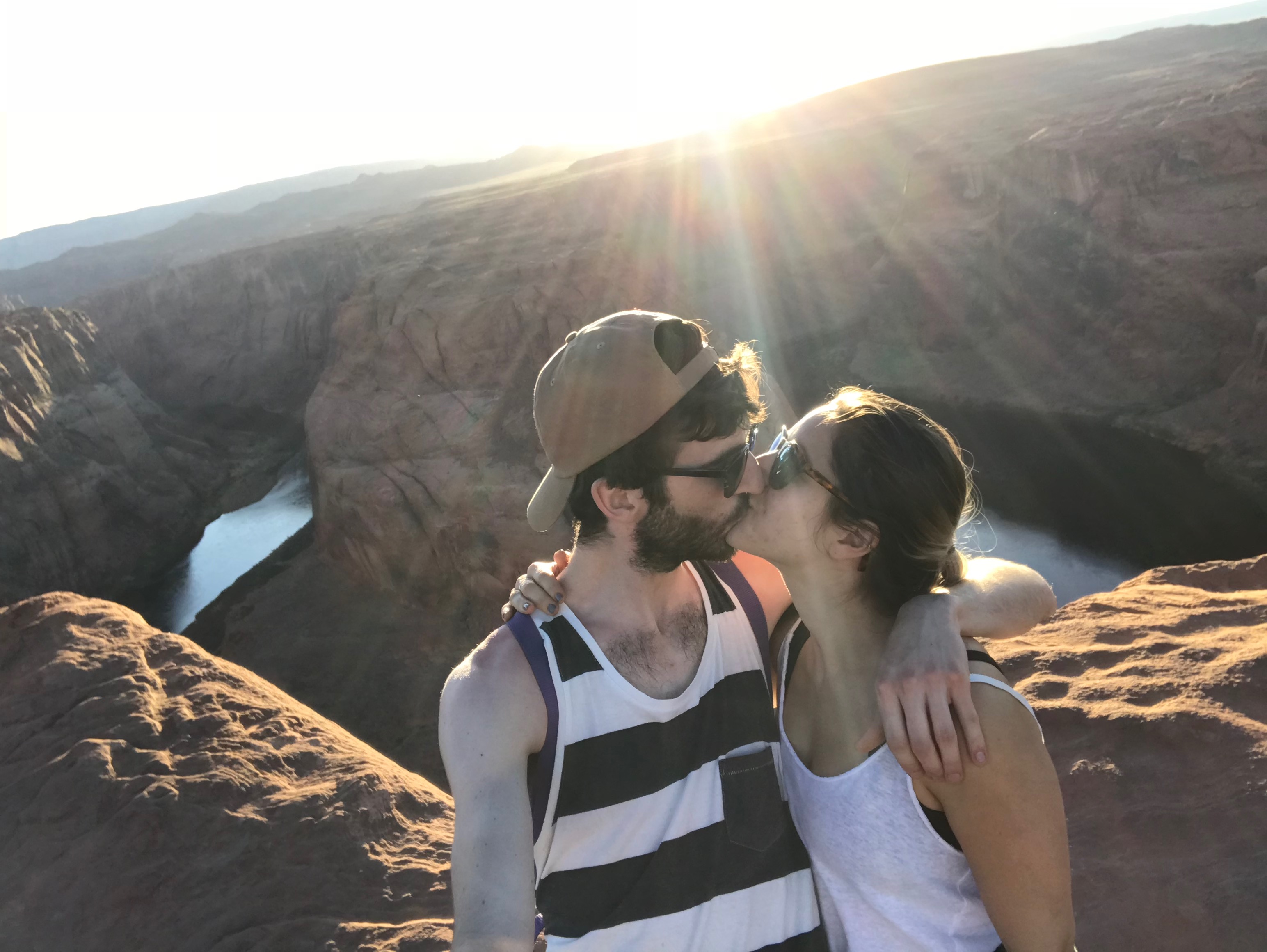 Couple kissing at sunset overlooking a canyon.