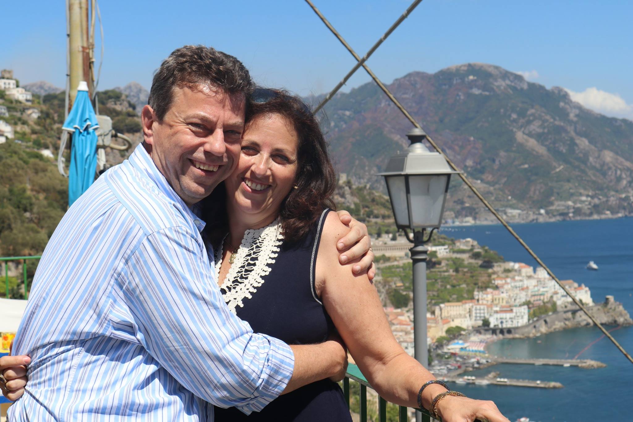 Portrait painting of a smiling couple embracing, with a scenic coastal town in the background.