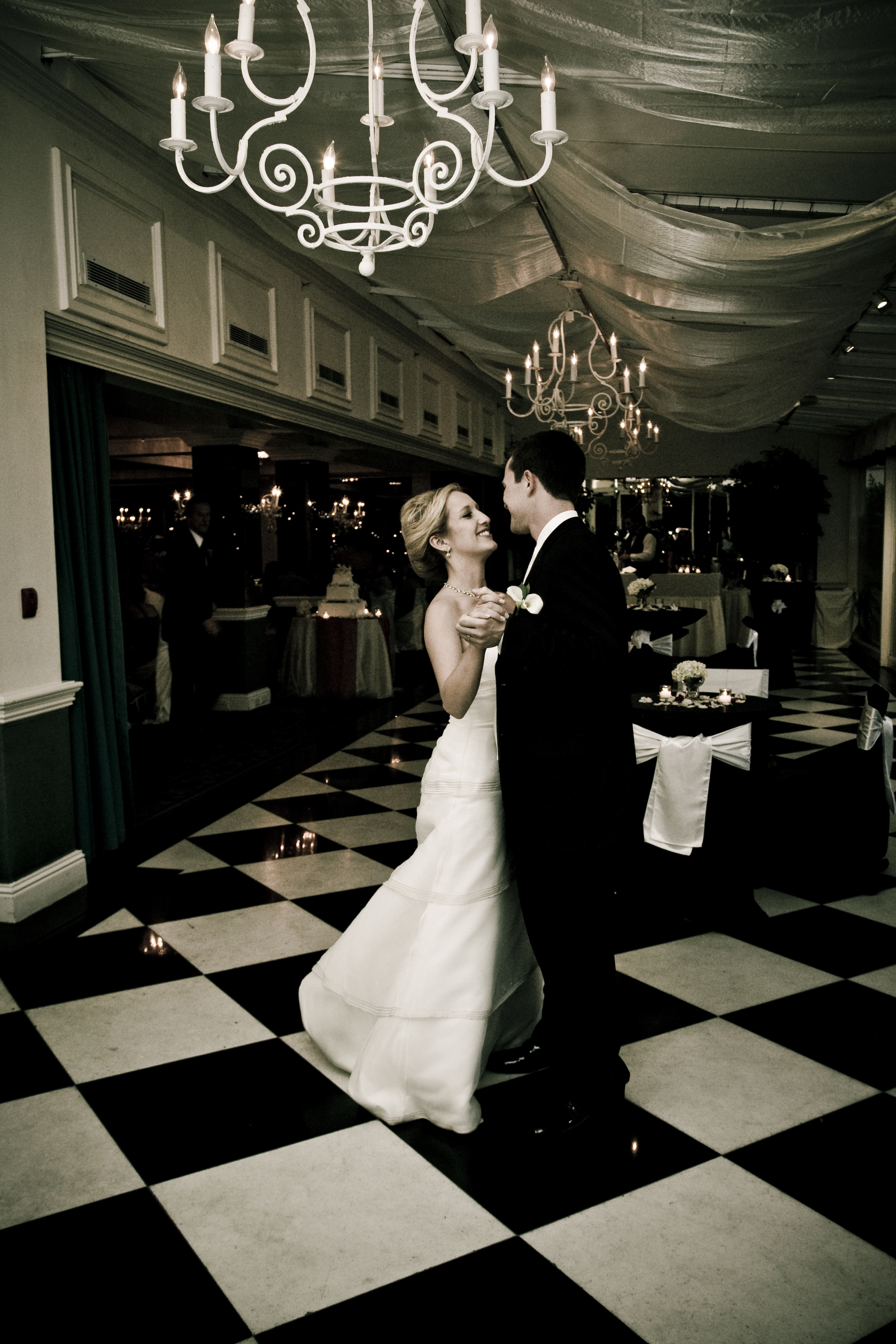 Painting of a bride and groom dancing at their wedding reception.