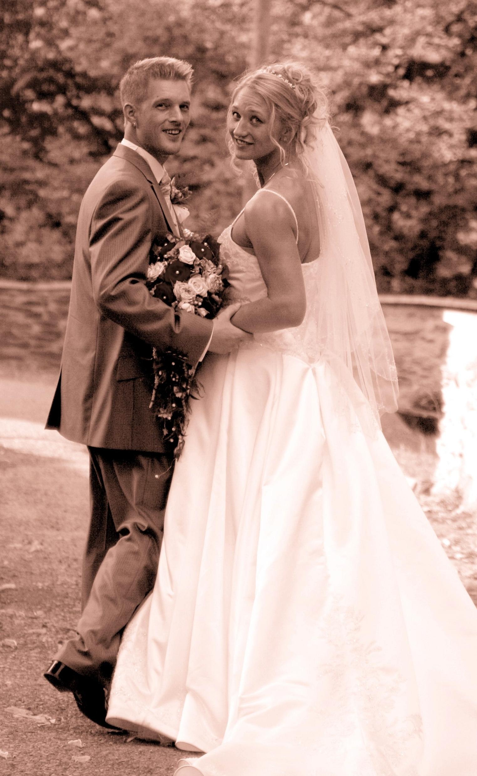 Sepia-toned painting of a bride and groom on their wedding day.