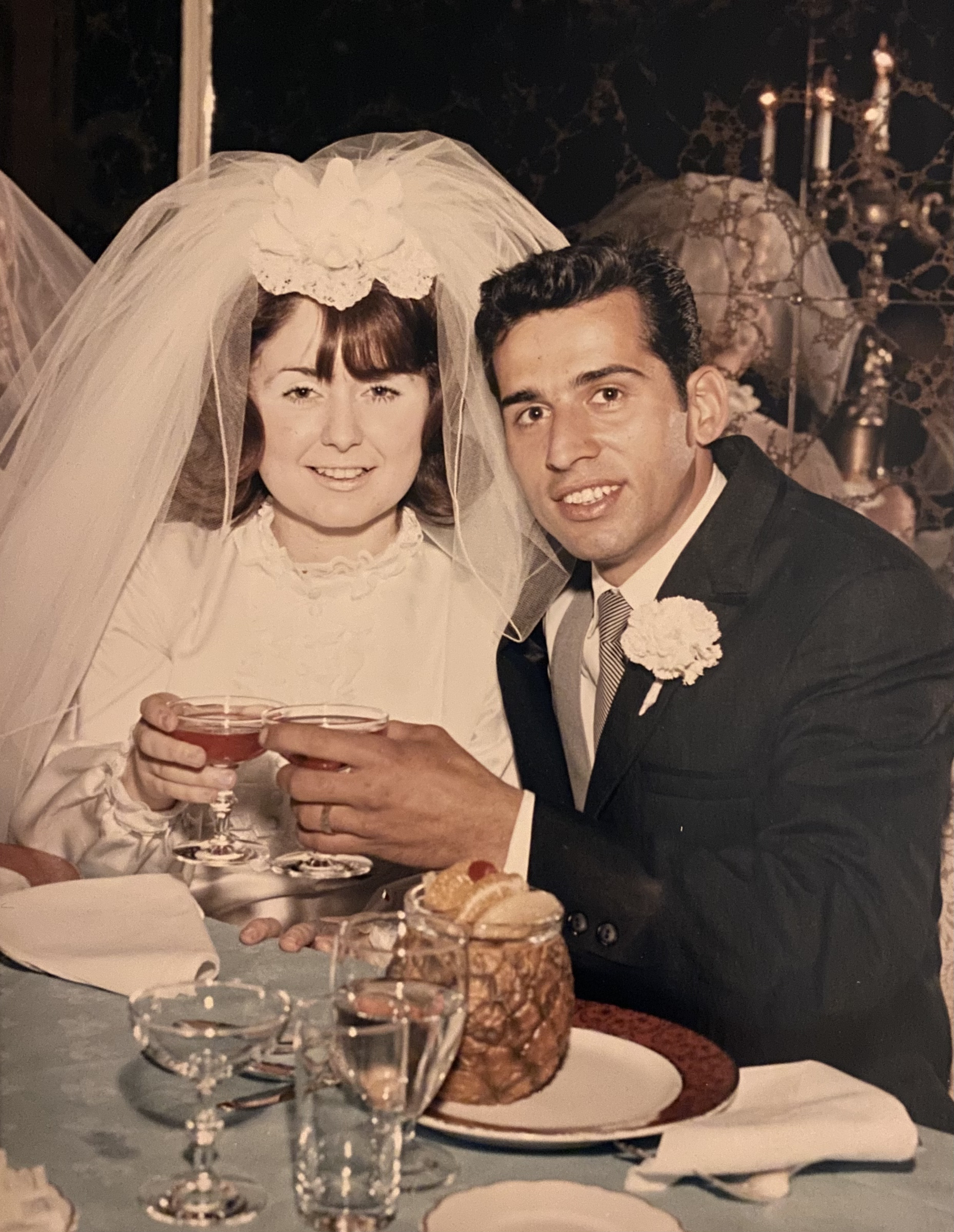 Painting of a bride and groom sitting on a couch in a dimly lit room with shelves behind them.