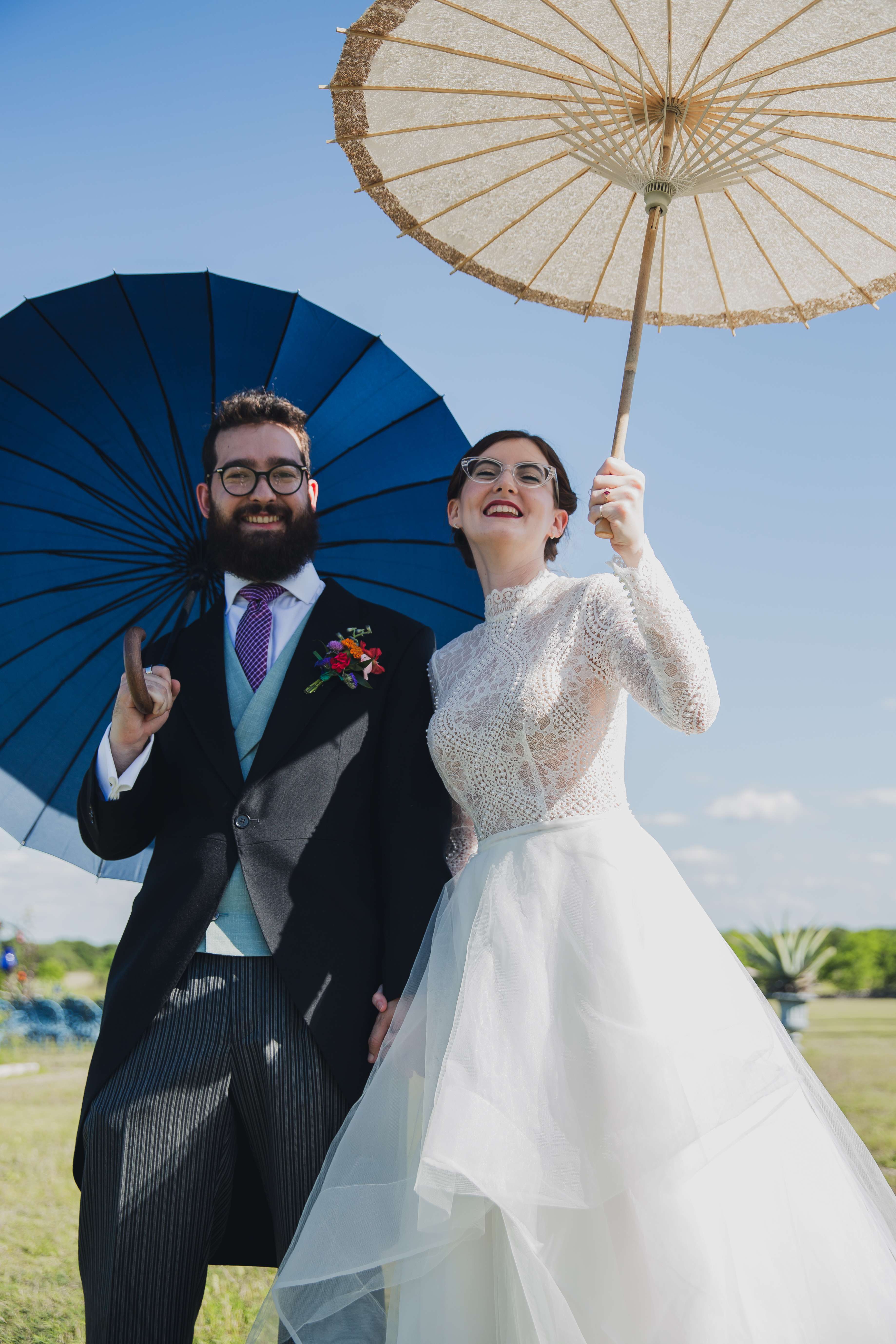 Romantic wedding portrait, bride and groom under a clear umbrella.