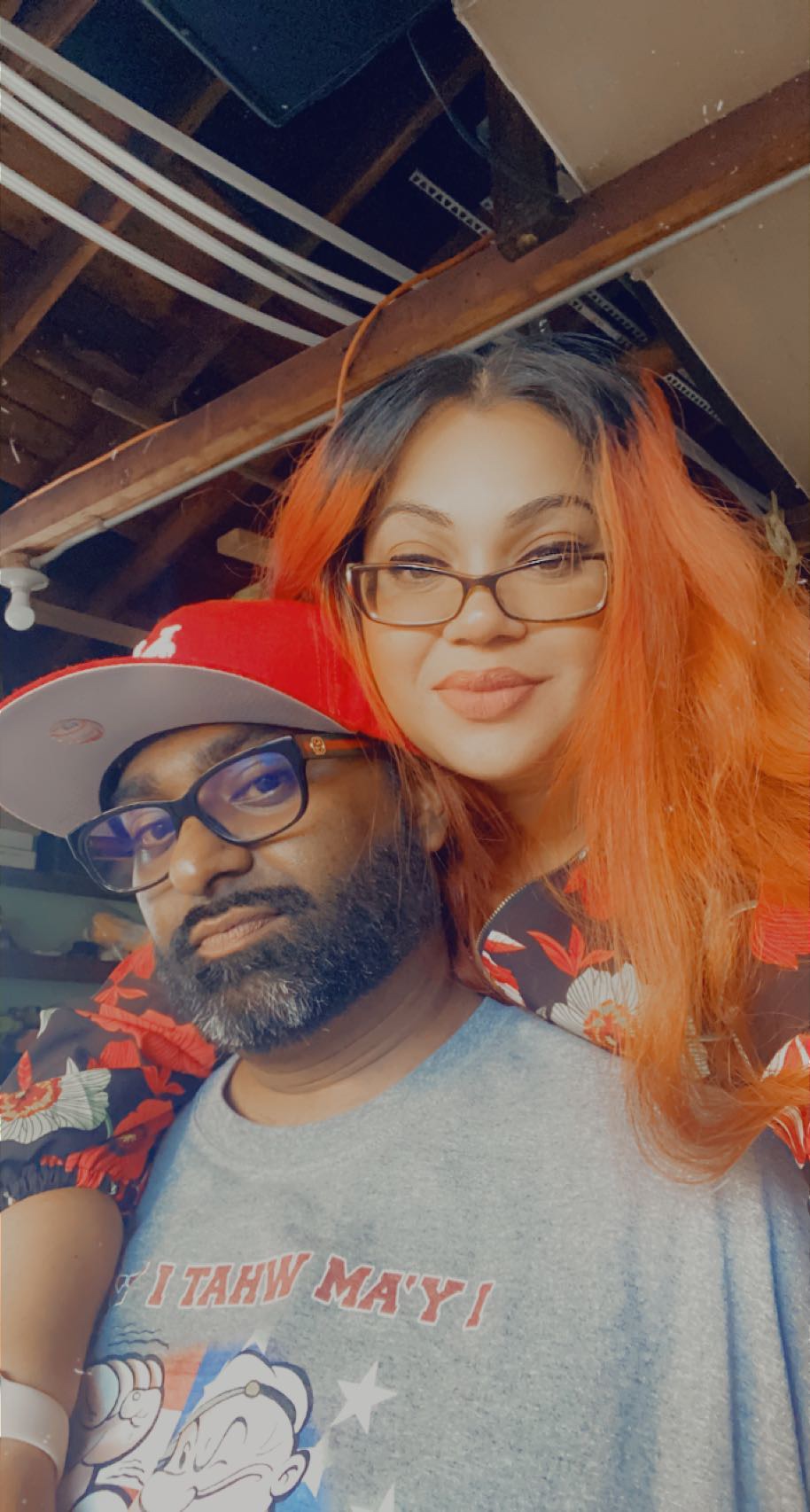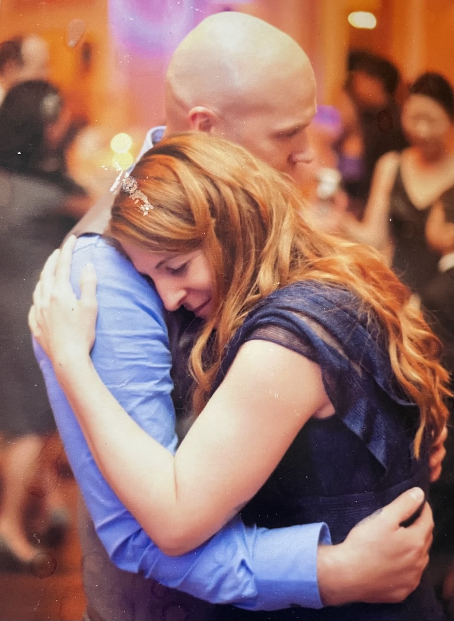 Painting of a couple embracing, the woman has long orange hair and glasses, the man wears a red cap and glasses.