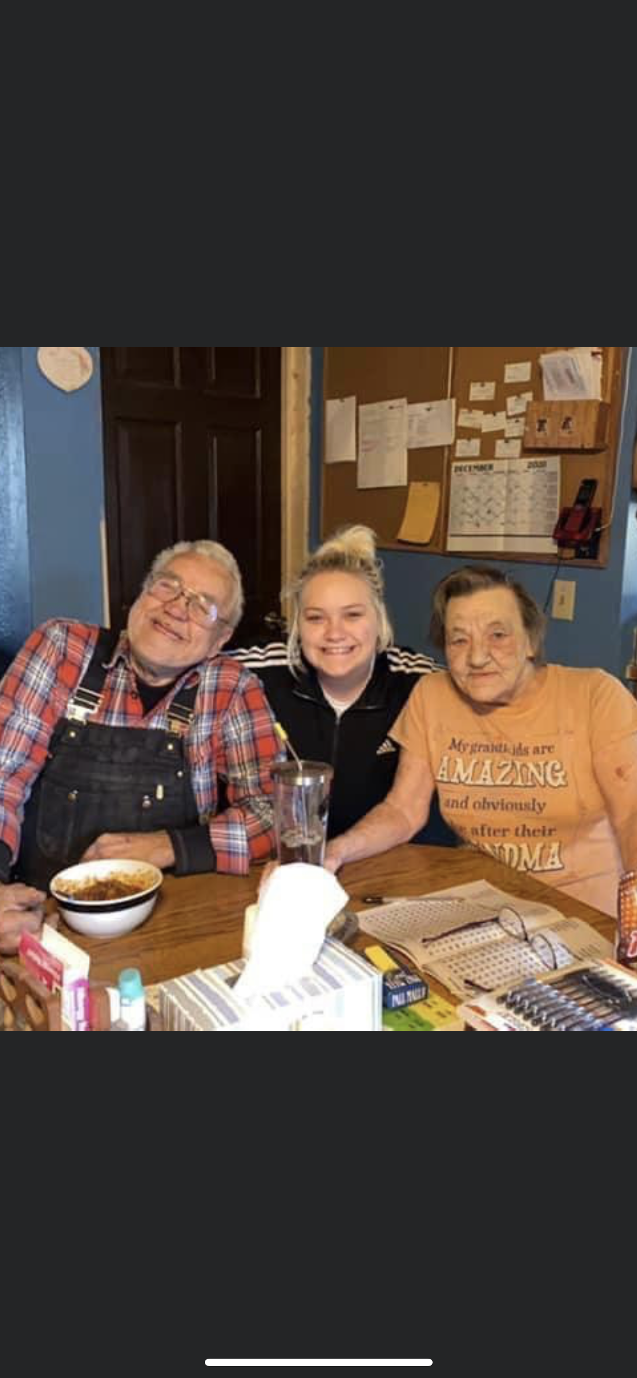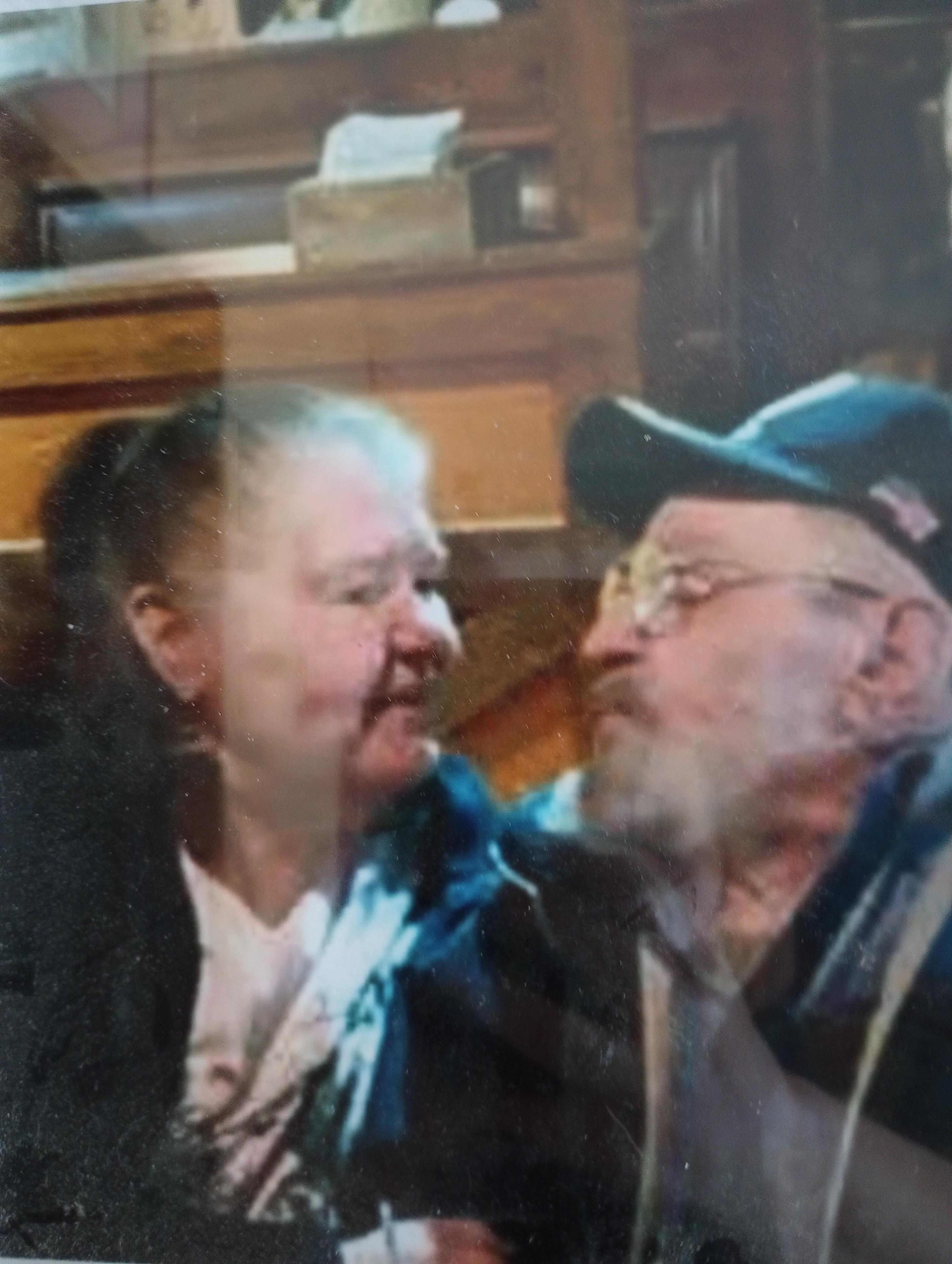 Painted portrait of elderly couple, man in blue shirt and woman in red plaid shirt, near Christmas tree.