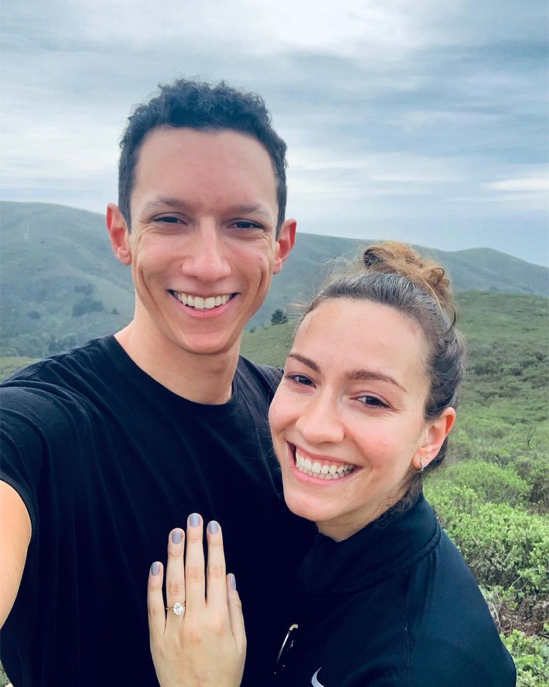 Painting of an engaged couple smiling, woman showing off engagement ring