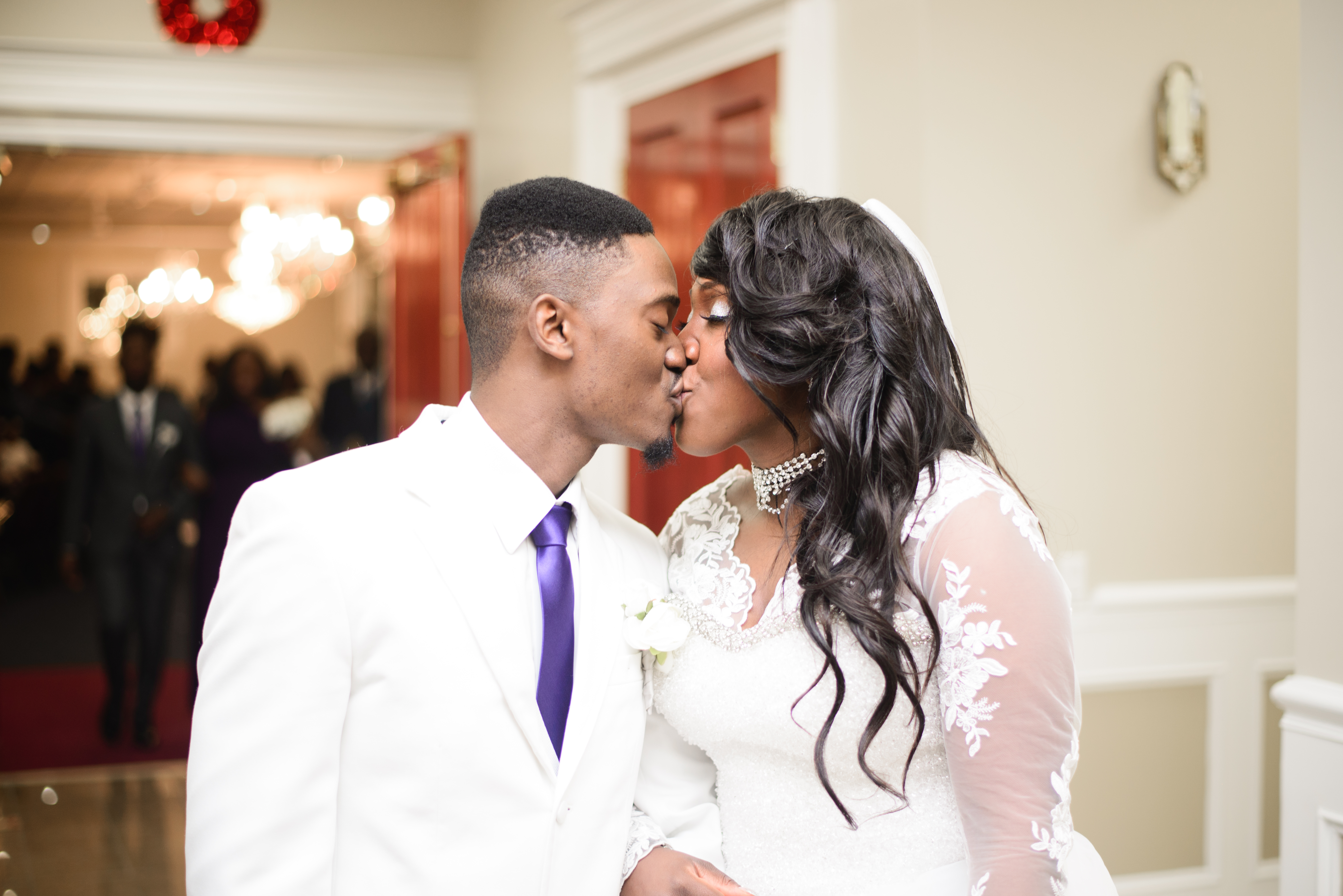 Painting of a bride and groom kissing.