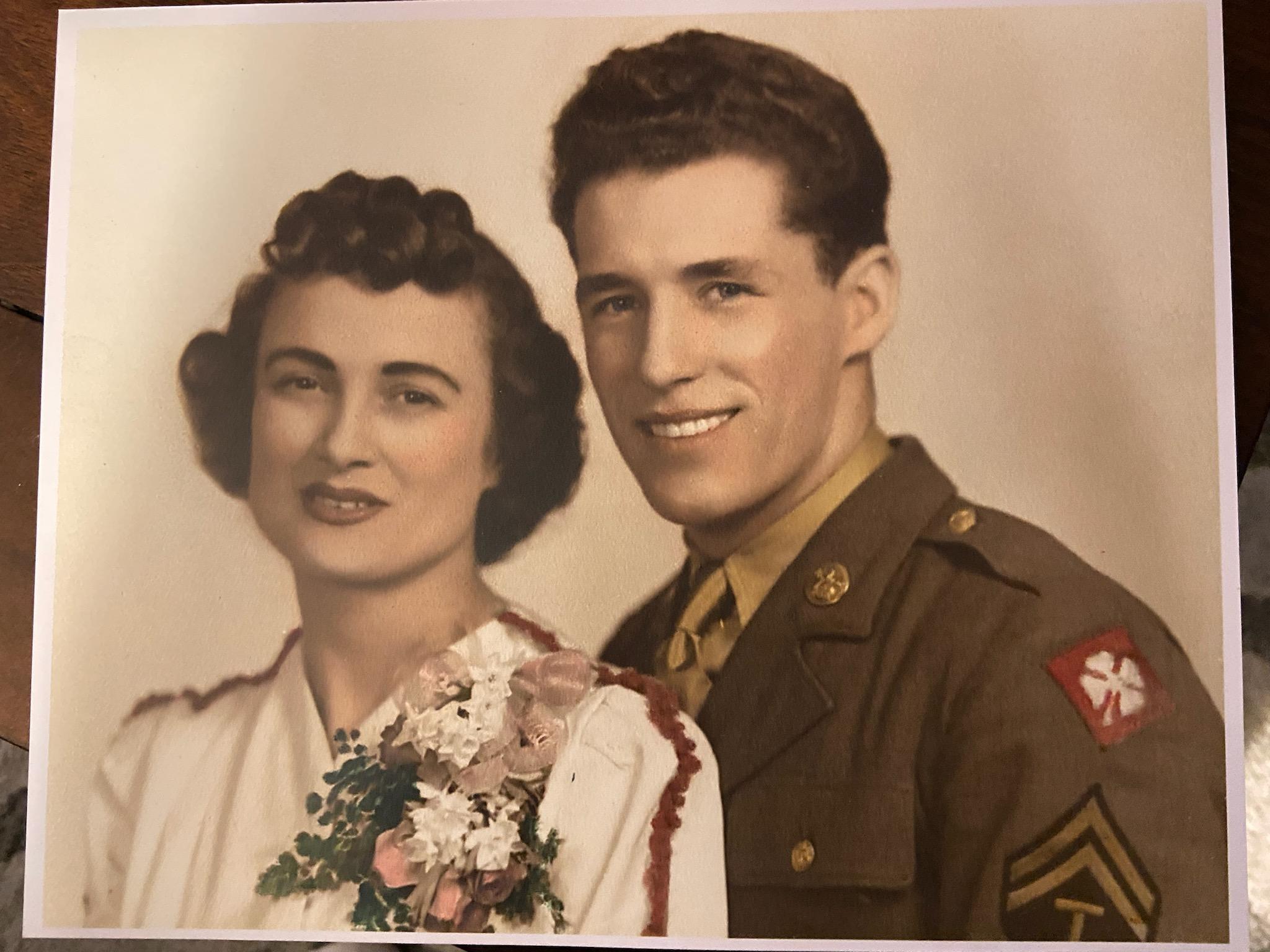 Smiling woman holding framed portrait of a young couple, one in military uniform.