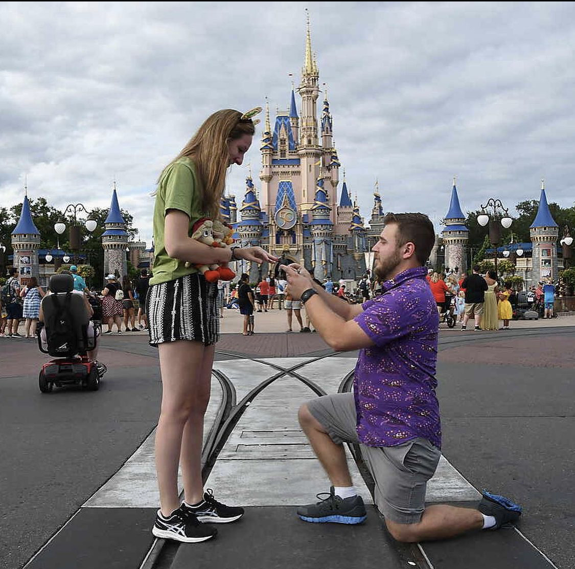 Painting of a marriage proposal in front of Cinderella Castle at Disney World.