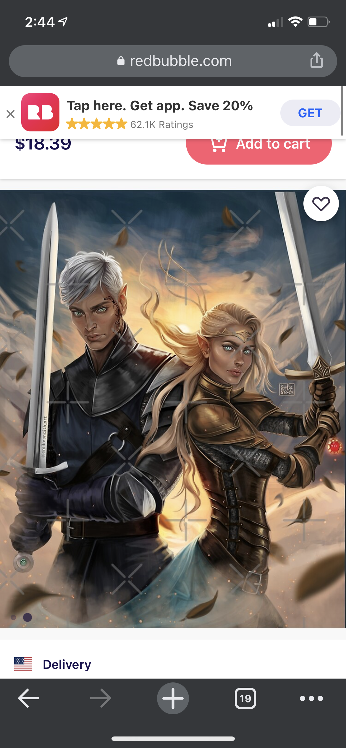 Painting of a man and woman in fantasy armor holding swords, with text For my Aelin below.