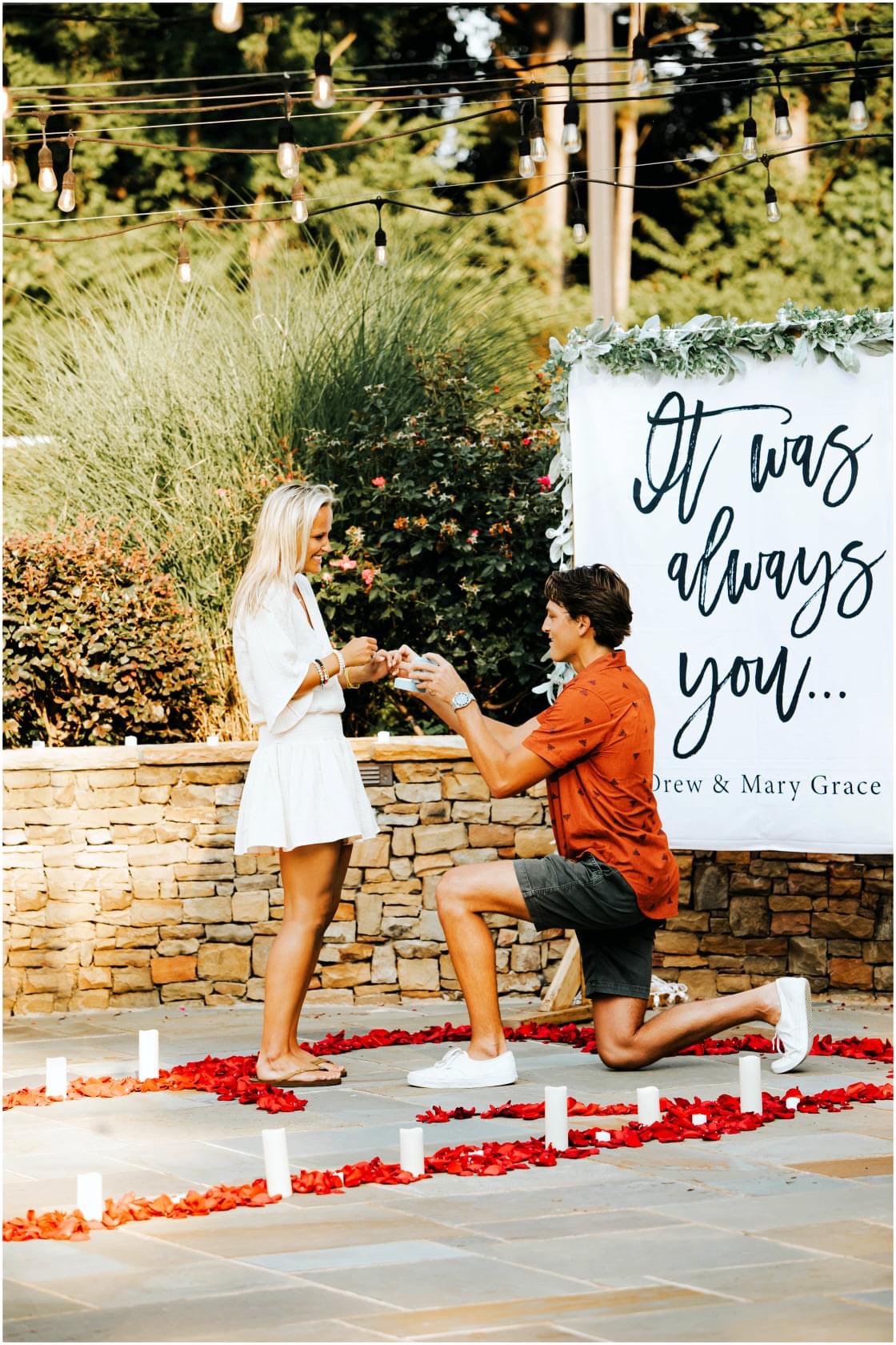 Painting of a marriage proposal: a man kneeling, presenting a ring to a woman.  It was always you... is on a sign behind them.