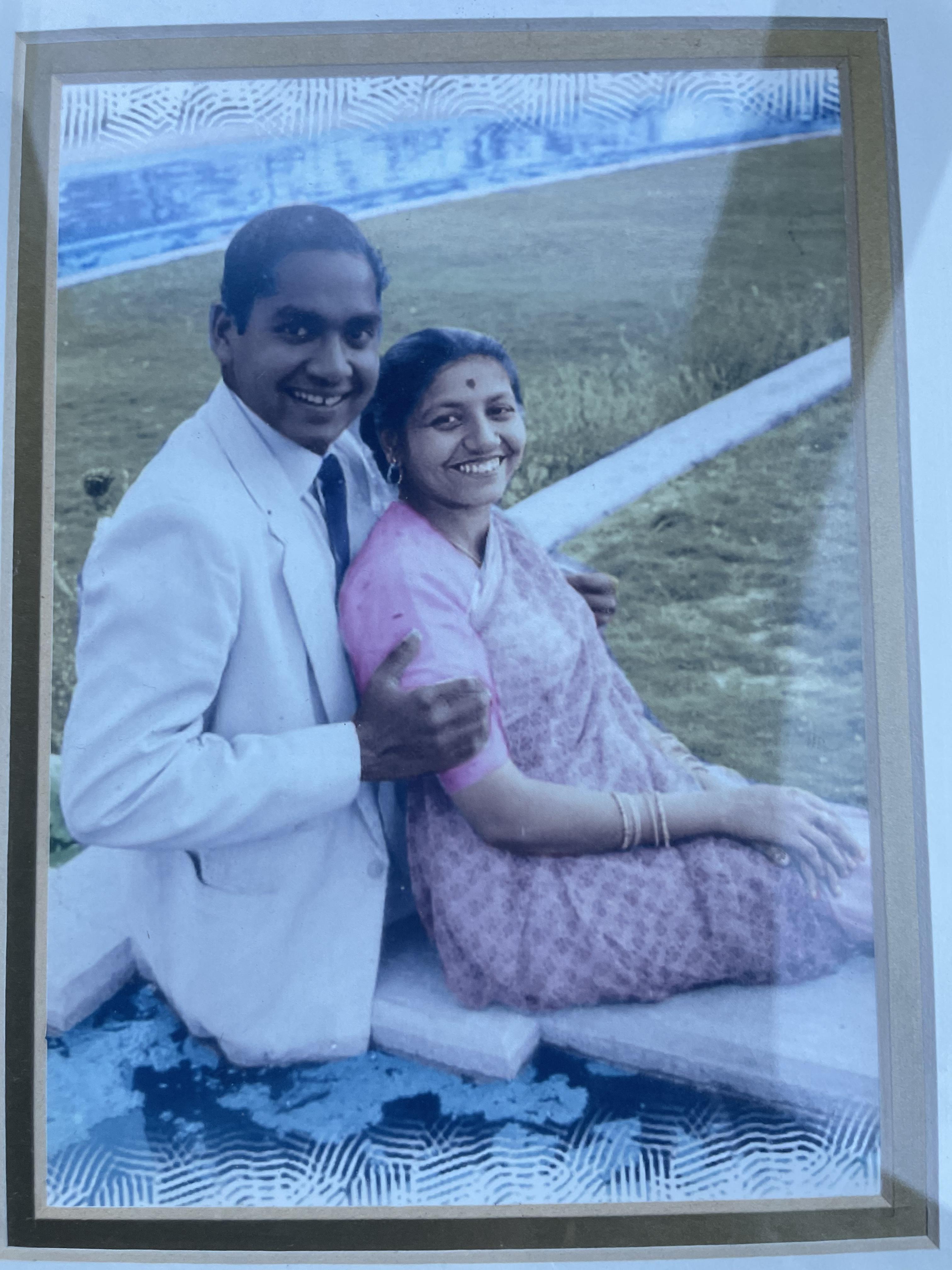 Painting of a smiling couple, the man in a white jacket and the woman in a pink sari, against a green background.