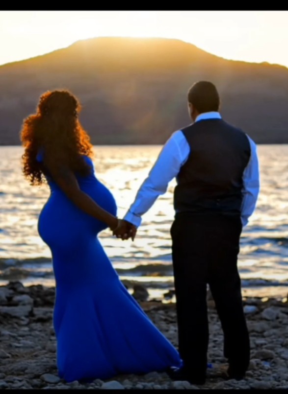 Pregnant woman and man holding hands on beach at sunset, hill in background.
