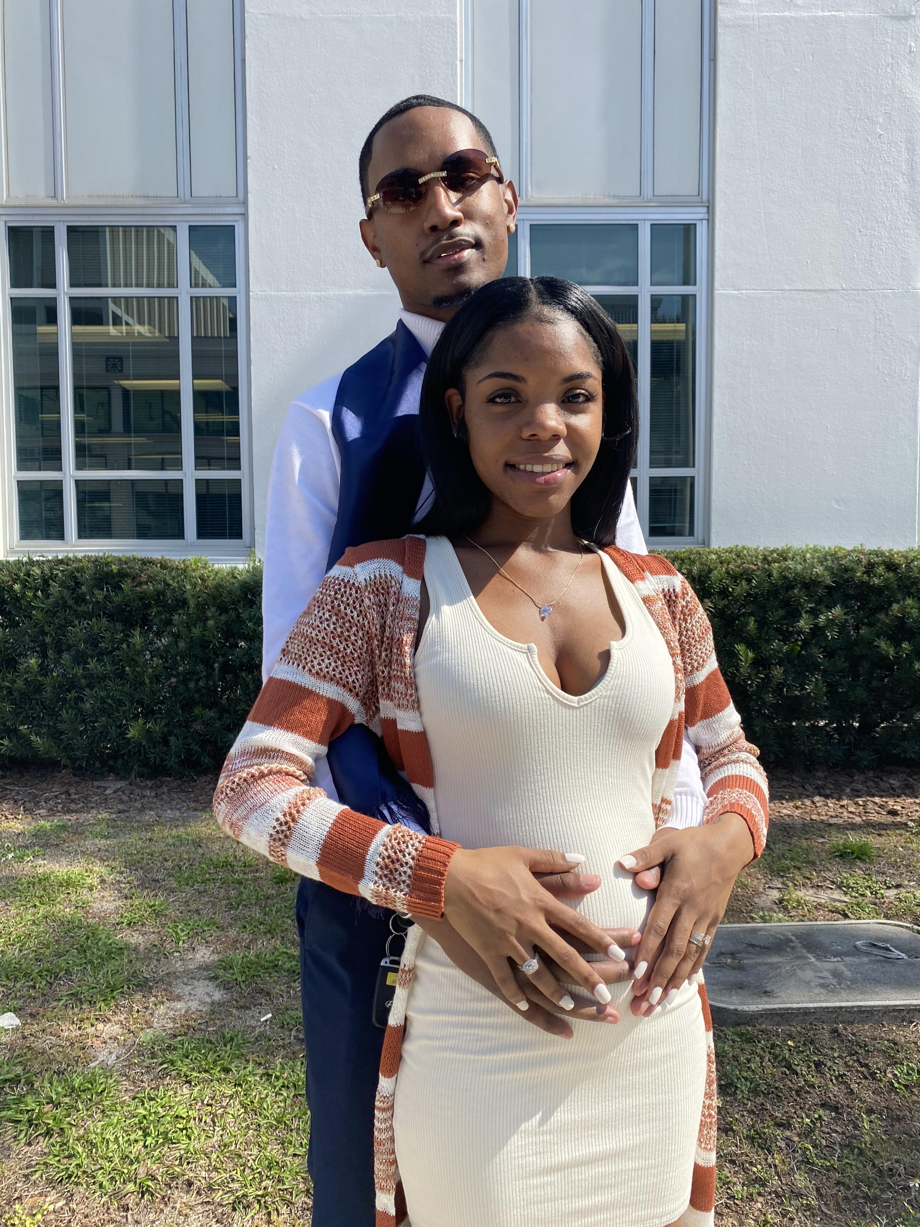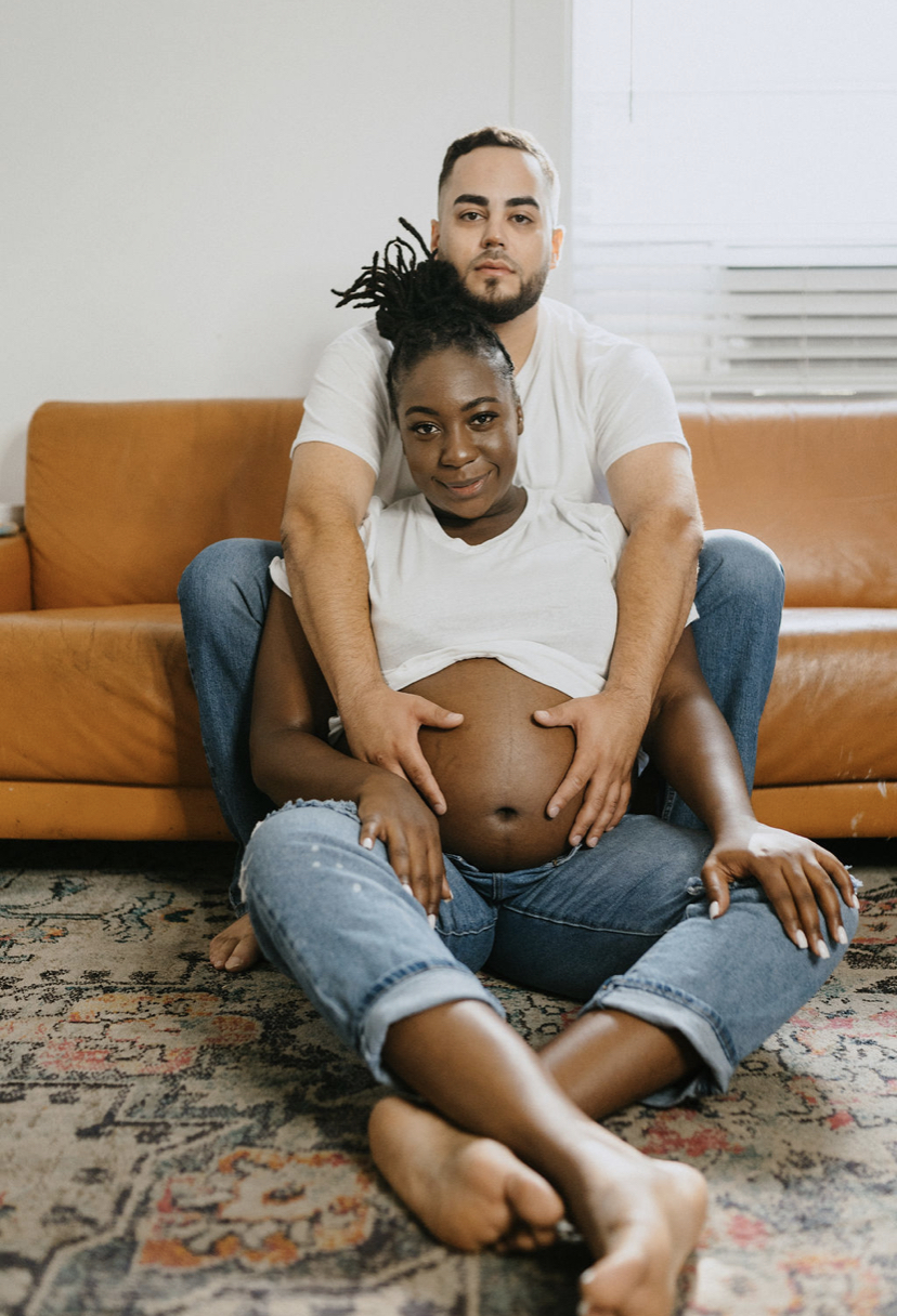 Painting of a pregnant Black woman and a man sitting on a couch, man`s hands on her belly.
