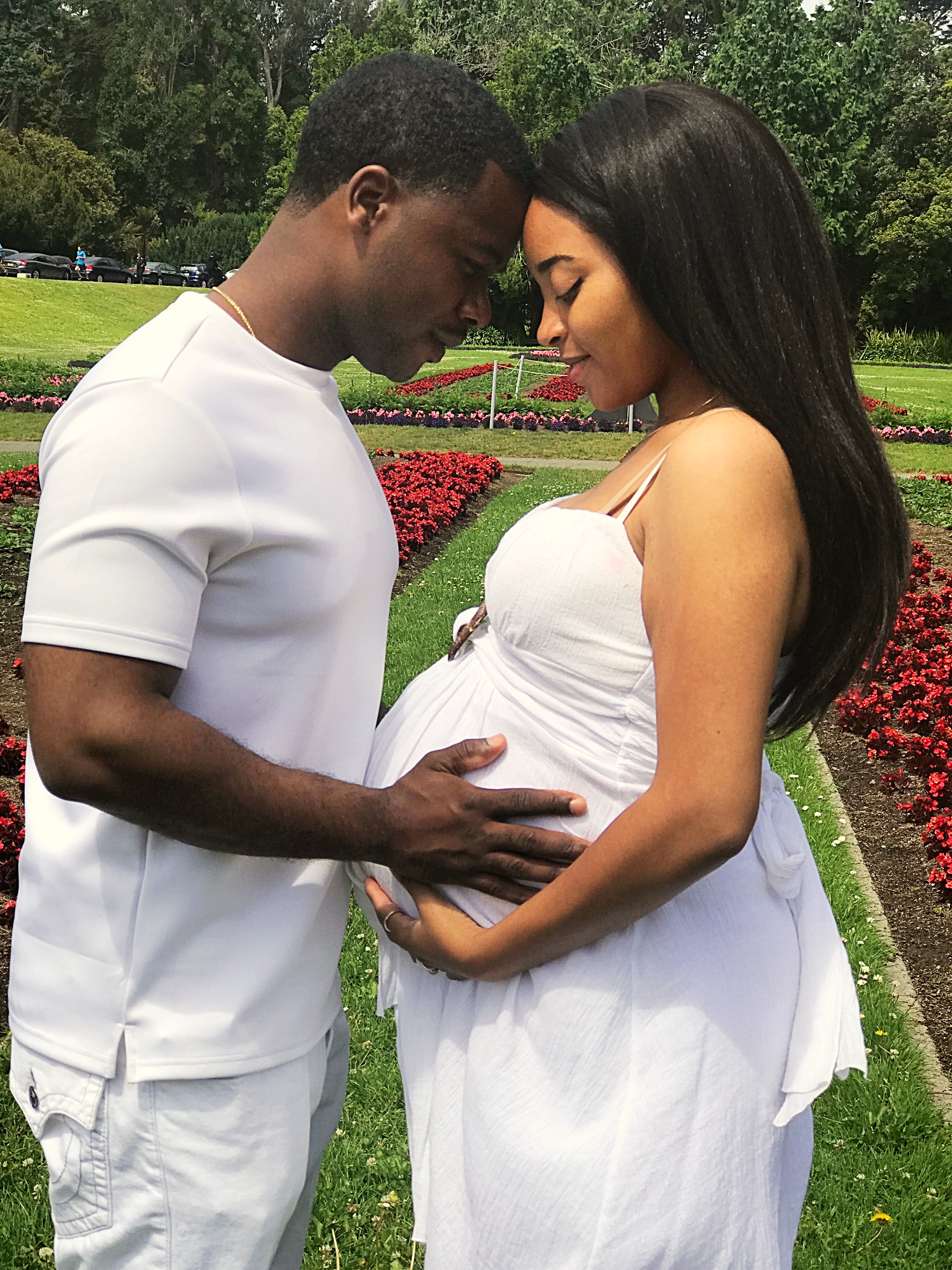 Painting of a pregnant Black woman and man embracing.