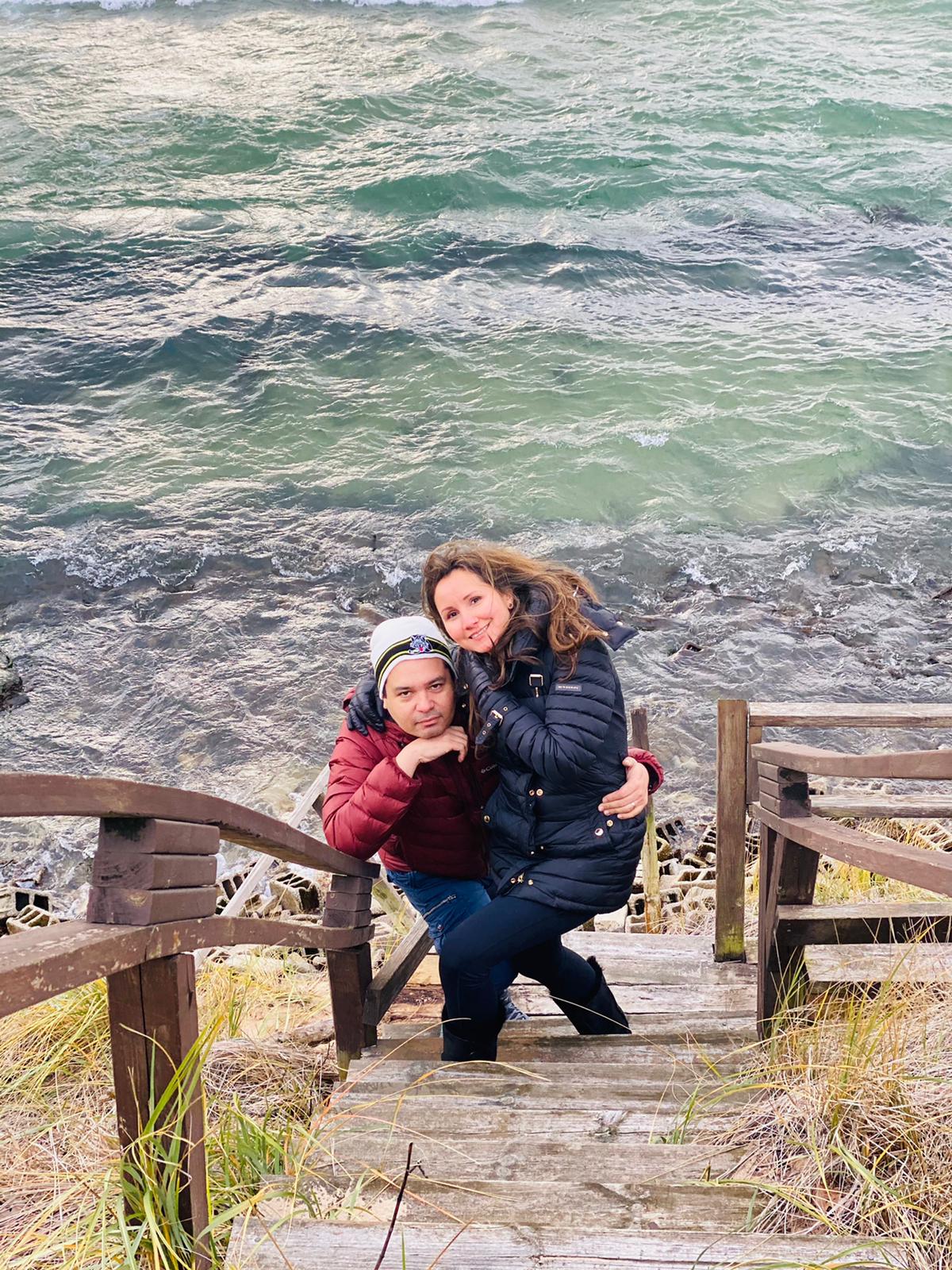 Painting of a couple embracing on a wooden staircase near the ocean.